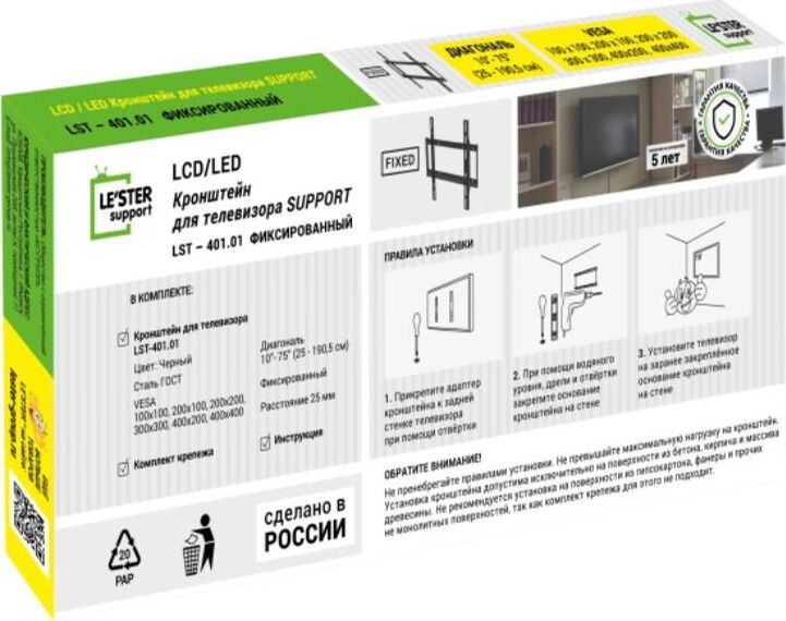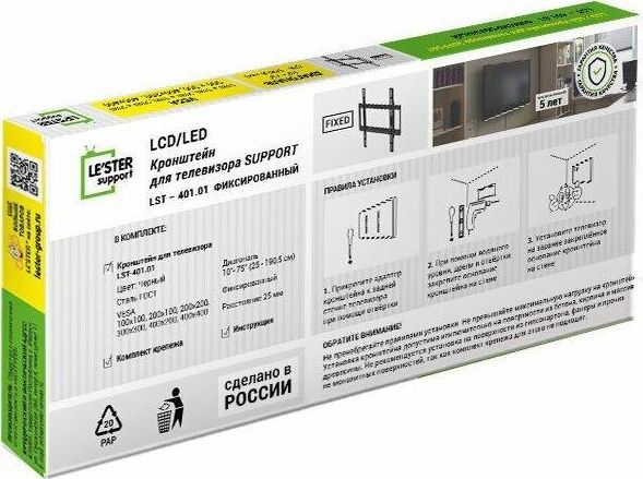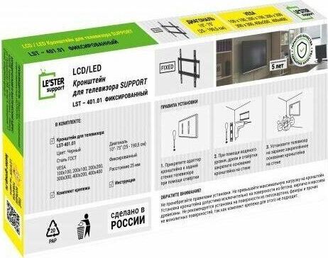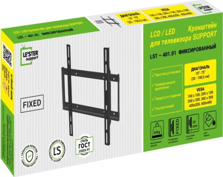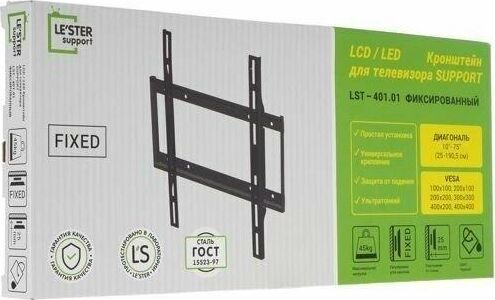 Фиксированный Диагональ: 10"-75" (25-190,5см) Расстояние от стены: 25 мм Нагрузка: 45 кг Толщина металла 1,5 мм. Vesa 400*400.
