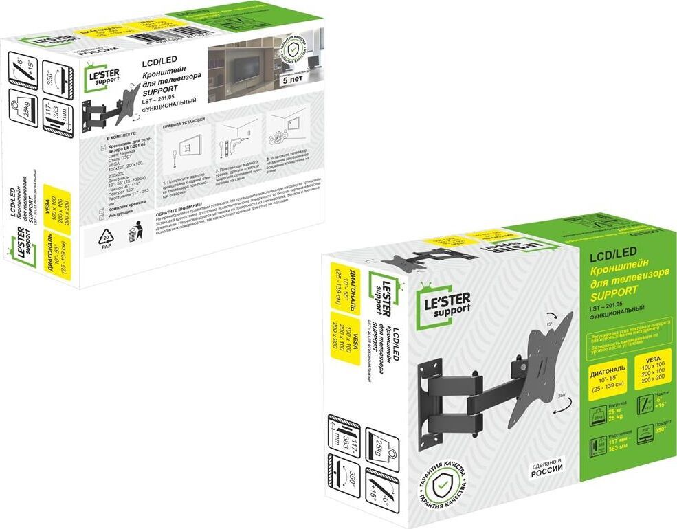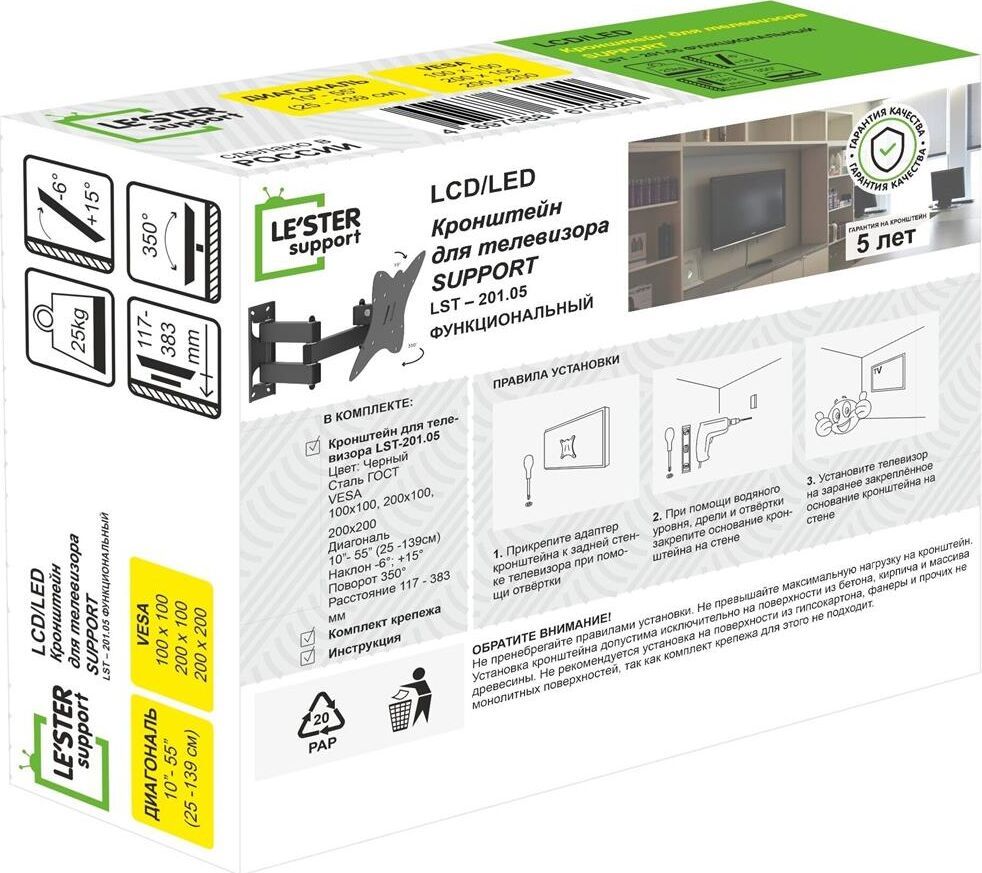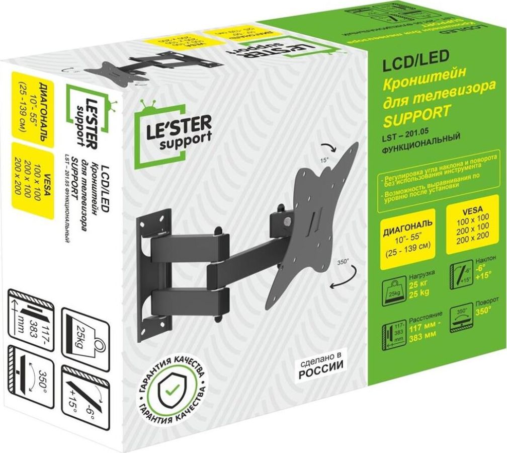 Наклонный-поворотный (Функц) Диагональ: 10"-55" (25-139см) Расстояние от стены: 117-383 мм Угол наклона: -6°/+15° Угол поворота: 350° Нагрузка: 25 кг Толщина металла адаптера 1,5 мм, основания 2 мм. Регулировка угла наклона и поворота без использования инструмента. Vesa 200*200.