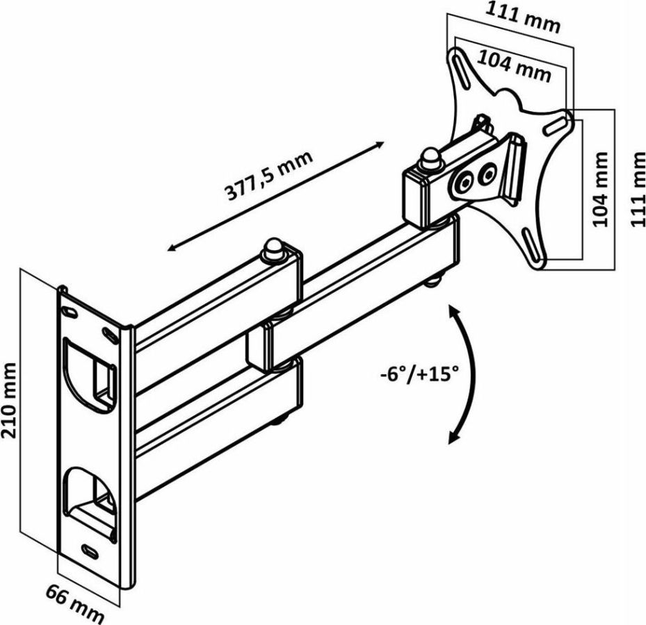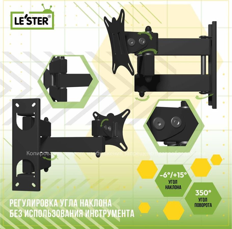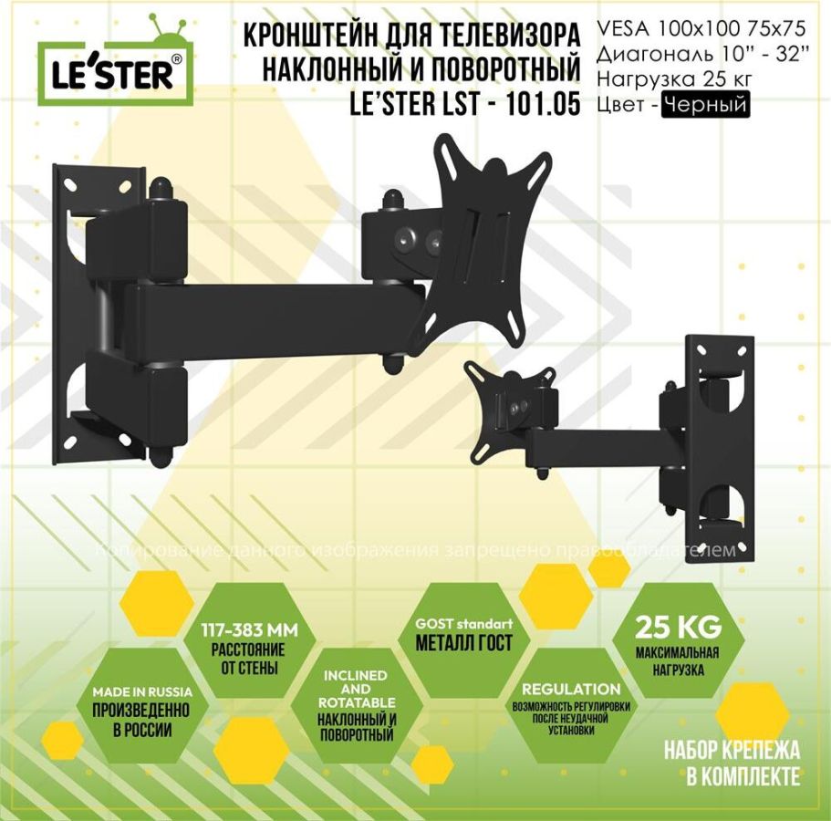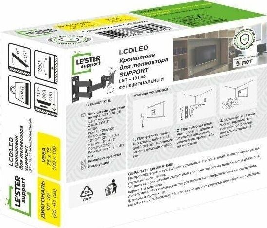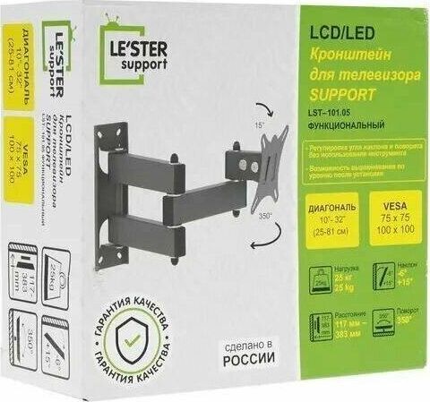 Наклонный-поворотный (Функц) Диагональ: 10"-32" (25-81см) Расстояние от стены: 117-383 мм Угол наклона: -6°/+15° Угол поворота: 350° Нагрузка: 25 кг Толщина металла адаптера 1,5 мм, основания 2 мм. Регулировка угла наклона и поворота без использования инструмента. Vesa 100*100.