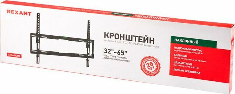 Кронштейн на стену для телевизора диагональю: 32"-65" дюймов наклонный REXANT серия HOME Тип: наклонный Назначение: для LED/LCD/PLASMA телевизоров и мониторов Цвет: черный Мин. диагональ: ТВ 32 дюйма Макс. диагональ: ТВ 65 дюймов Максимальный вес оборудования: 40 кг Тип монтажа: настенный Угол наклона: -0°/+8° Расстояние от стены до кронштейна: 23 мм Поддержка крепления стандарта VESA: 75х75/100х100/200x200/300x300/400x400/600х400 Крепление: в комплекте.