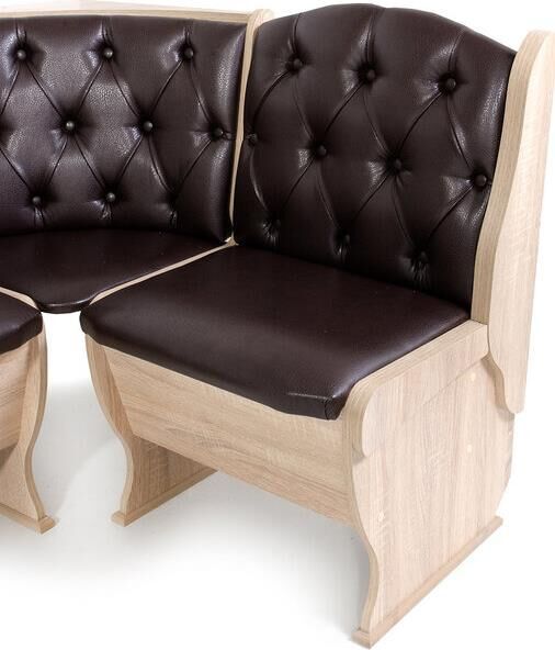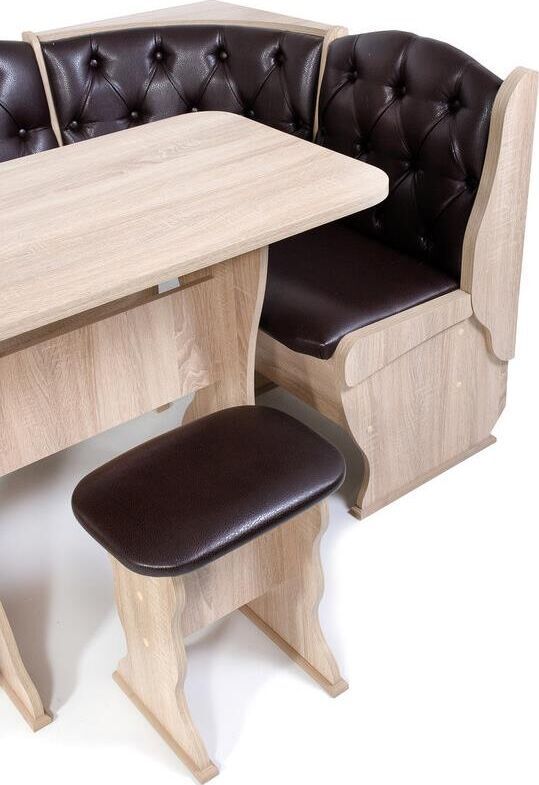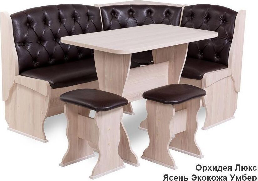 В комплект кухонного уголка Орхидея Люкс входит: стол обеденный со столешницей в цвет корпуса с термостойким покрытием. два табурета Тюльпан, кухонная скамья с размером 1100 мм на 1500 мм, с внутренними ящиками для хранения под сидением, декор мягкой части - каретная стяжка. Самый солидный вариант расцветки в экокоже - Барнео Умбер. Достойно смотрится на любой кухне, но особенно хорошо в классическом интерьере. Не требует тщательного ухода, практичен в уборке, достойно будут смотреться и в интерьере загородного дома. Размеры: скамья: 1500*1100*850 мм стол: 1000*580*750 мм табурет: 380*300*440 мм.