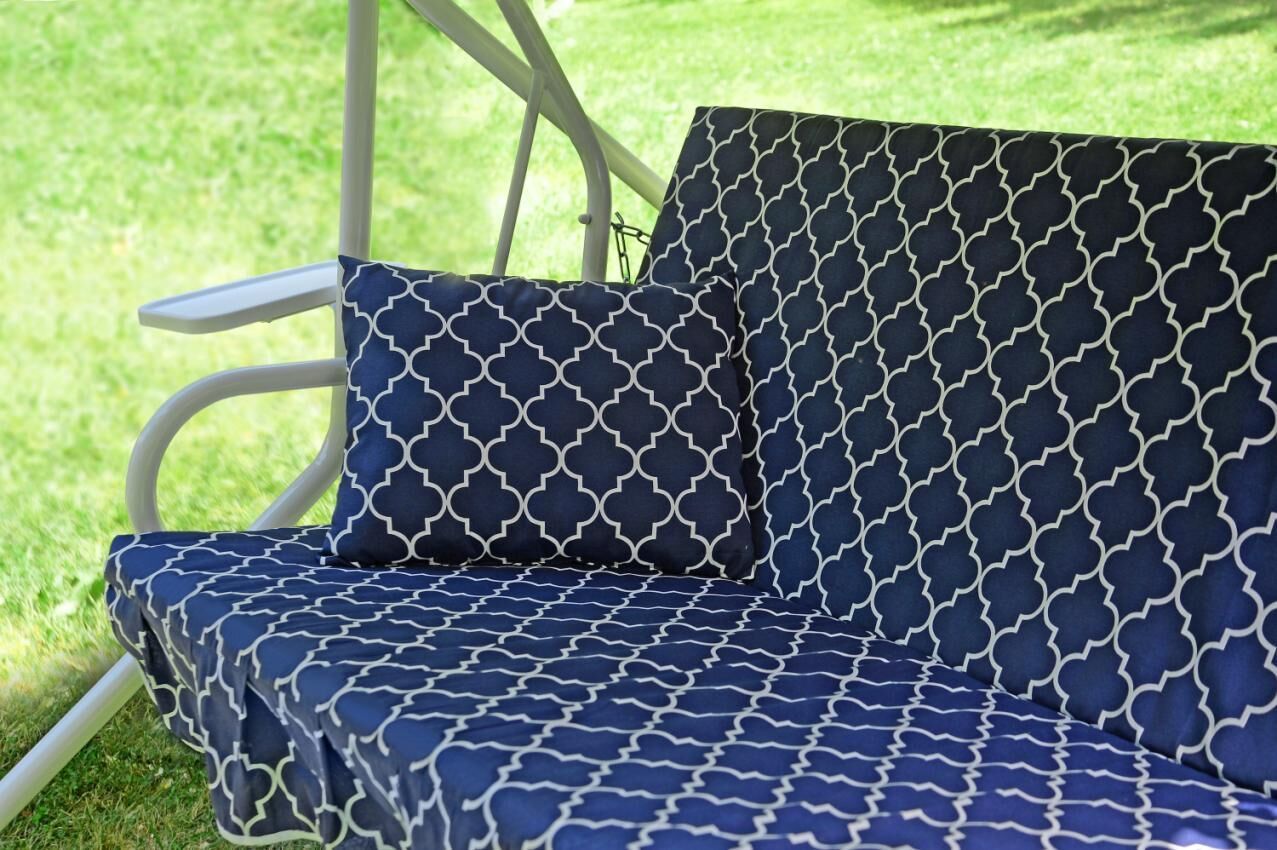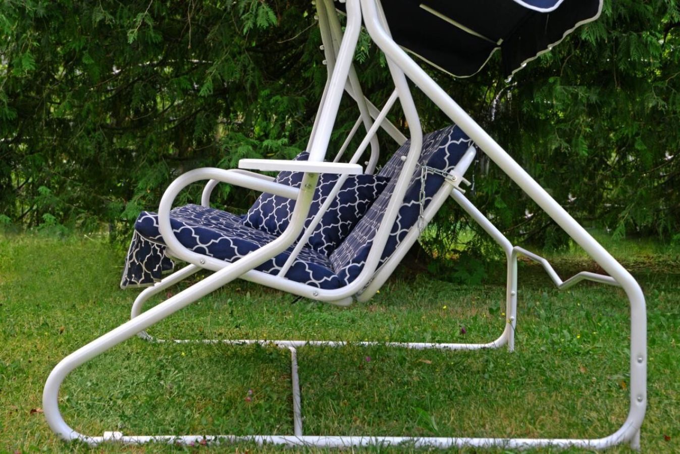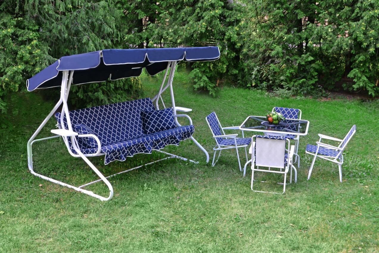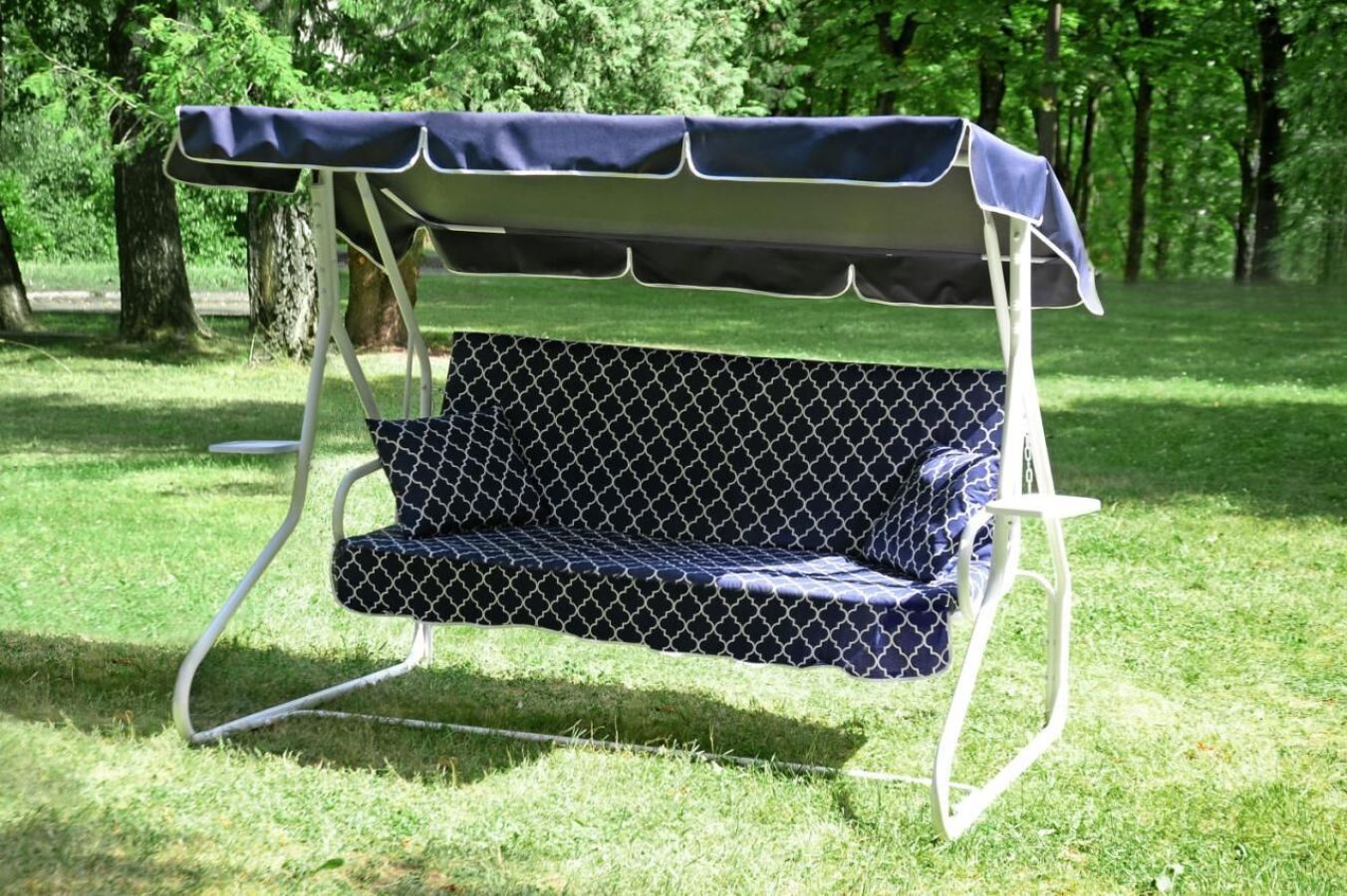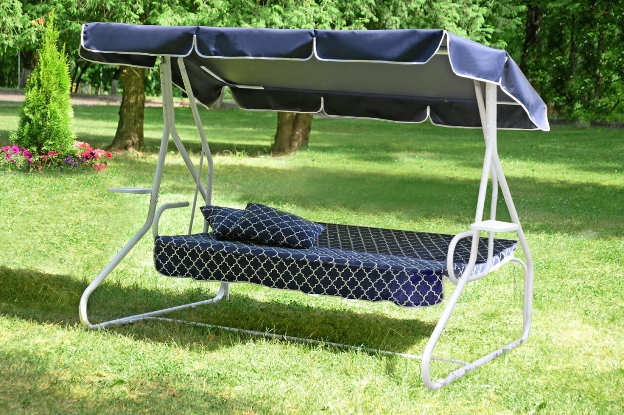 Габаритные размеры изделия (длина х ширина х высота), мм: 2115х1543х1600; размеры сиденья: 1706х540, размеры спинки: 1706х540, размеры тента: 1450х1972. Максимальная нагрузка, кг.: 280. Каркас: труба стальная Ø38х1,2мм, полимерное покрытие, полка - 2 шт. Мягкий элемент: ткань 45% п/э – 55% хлопок, плотность 108-111г/м2, наполнитель мягкого элемента - аэрофом 50мм +синтеаон, основание спанбел, наполнитель подушек - аэрофом. Подушки – 2шт. Тент: ткань с водоотталкивающей отделкой 100% п/э плотность 80г/м2. Регулировка спинки: звеньями цепи на требуемый угол наклона.