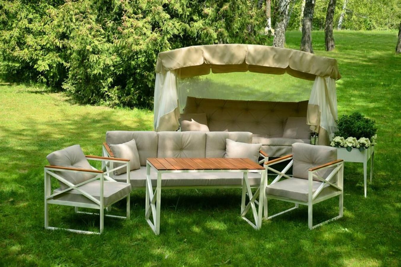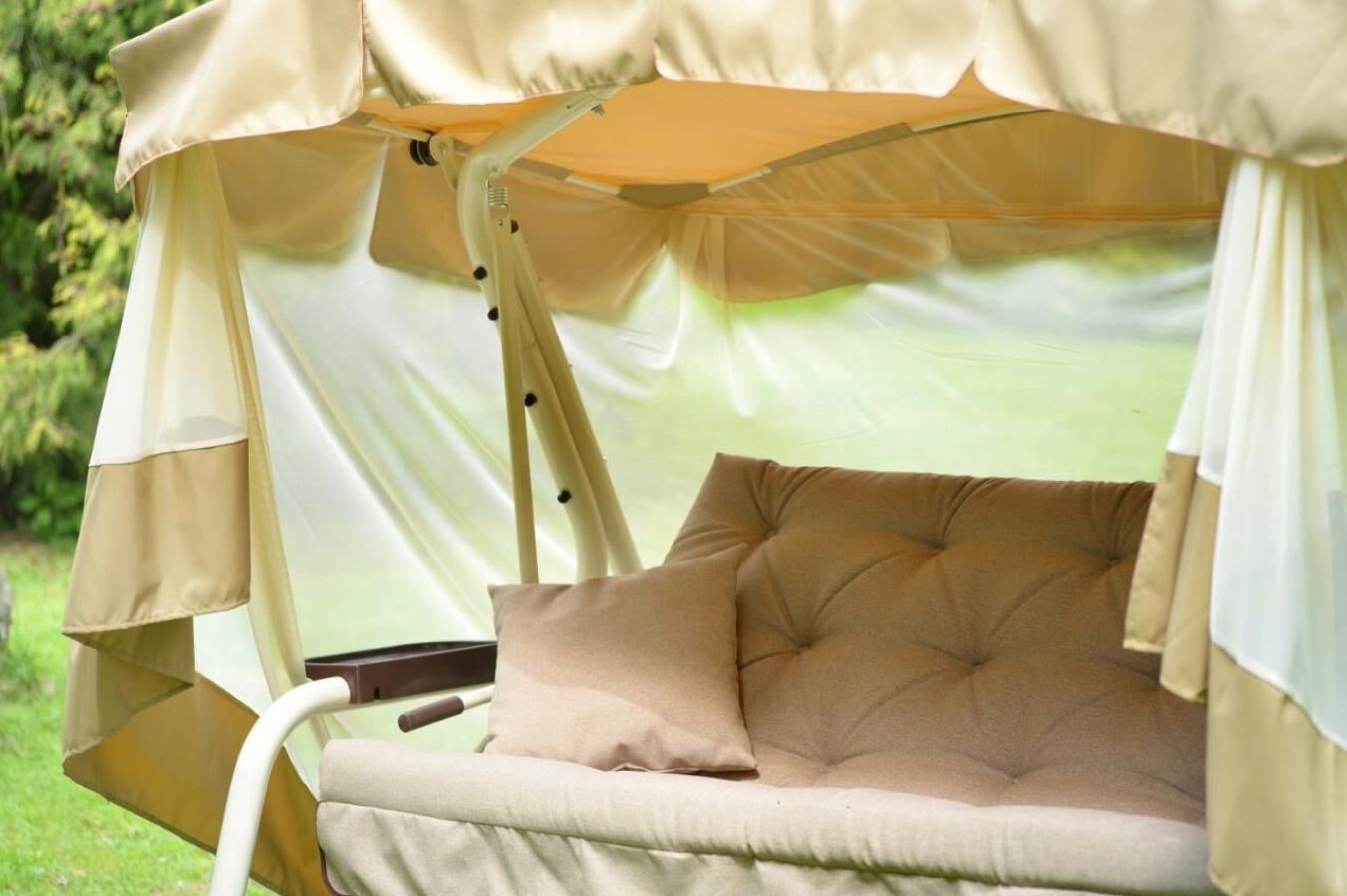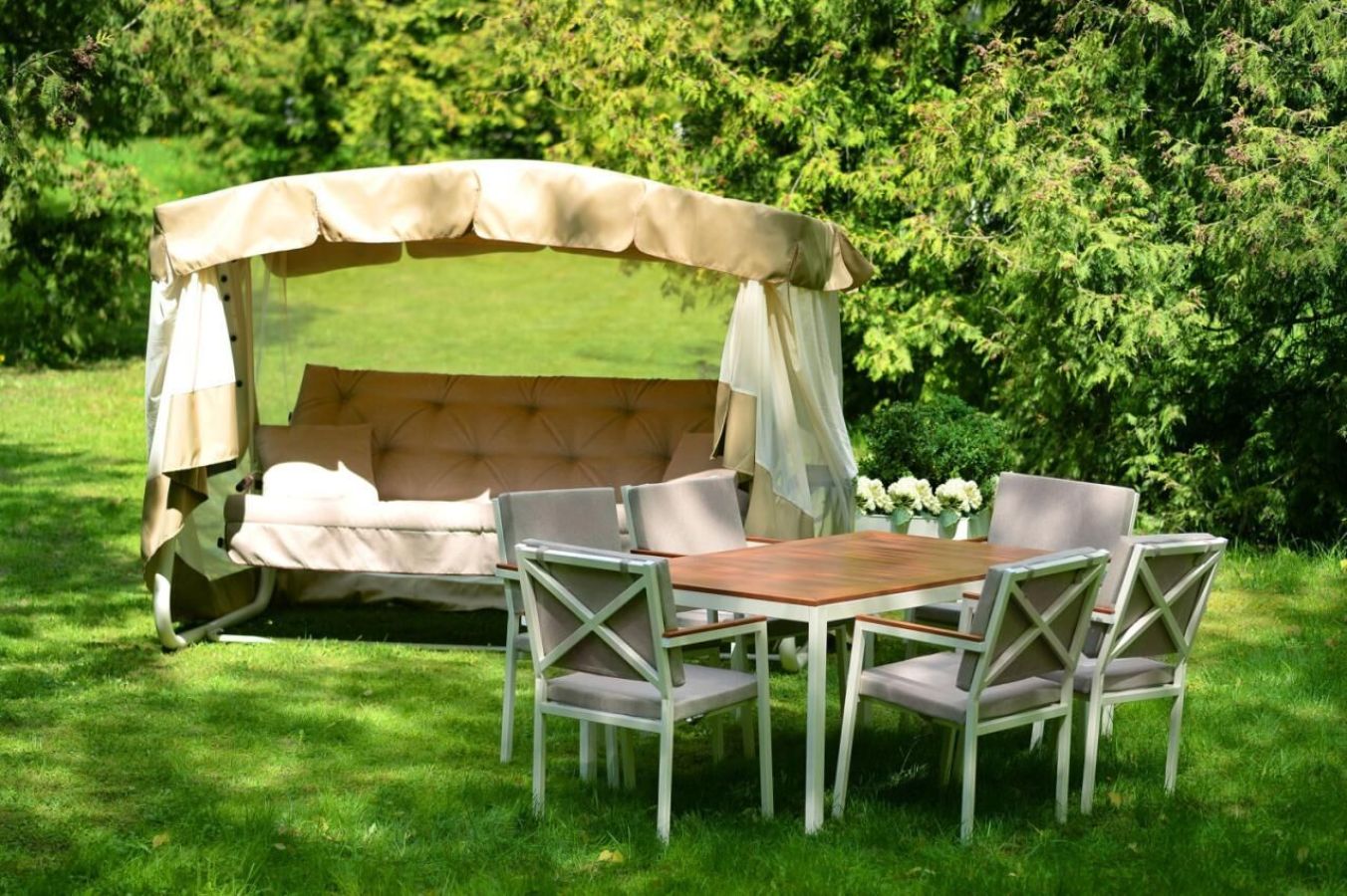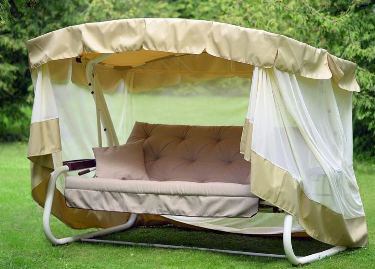 Габаритные размеры изделия (длина х ширина х высота), мм: 2665 ( 20)х1440 ( 20)х1860 ( 20) Габаритные размеры сиденья,спинки и тента (длина х ширина), мм: размеры сиденья: 1956х540 размеры спинки: 1956х755 размеры тента: 2430х1445х1975 Мягкий элемент: размер спинки: 1955х770; размер сиденья: 1955х540. Максимальная нагрузка, кг: 320. Каркас: труба стальная 60х1,5мм; полимерное покрытие; полка - 2 шт; фонарь светодиодный. Мягкий элемент: ткань 40% п/э; 60% хлопок, плотность 220-230г/м2, наполнитель мягкого элемента поролон листовой + синтепон ( общий толщиной 100мм). Подушки 2шт. Увеличенная длина сиденья. Декор сиденья и спинки пуговицами (или тафтингом). Тент: ткань с водоотталкивающей отделкой 100% п/э плотность 125г/м2. Сетка противомоскитная с боковыми вставками. Регулировка спинки: для раскладывания спинки поднимается ручка трансформации. Фиксаторы, расположенные на спинке, защелкиваются на дуге.