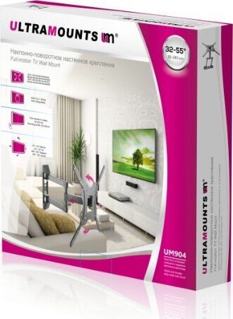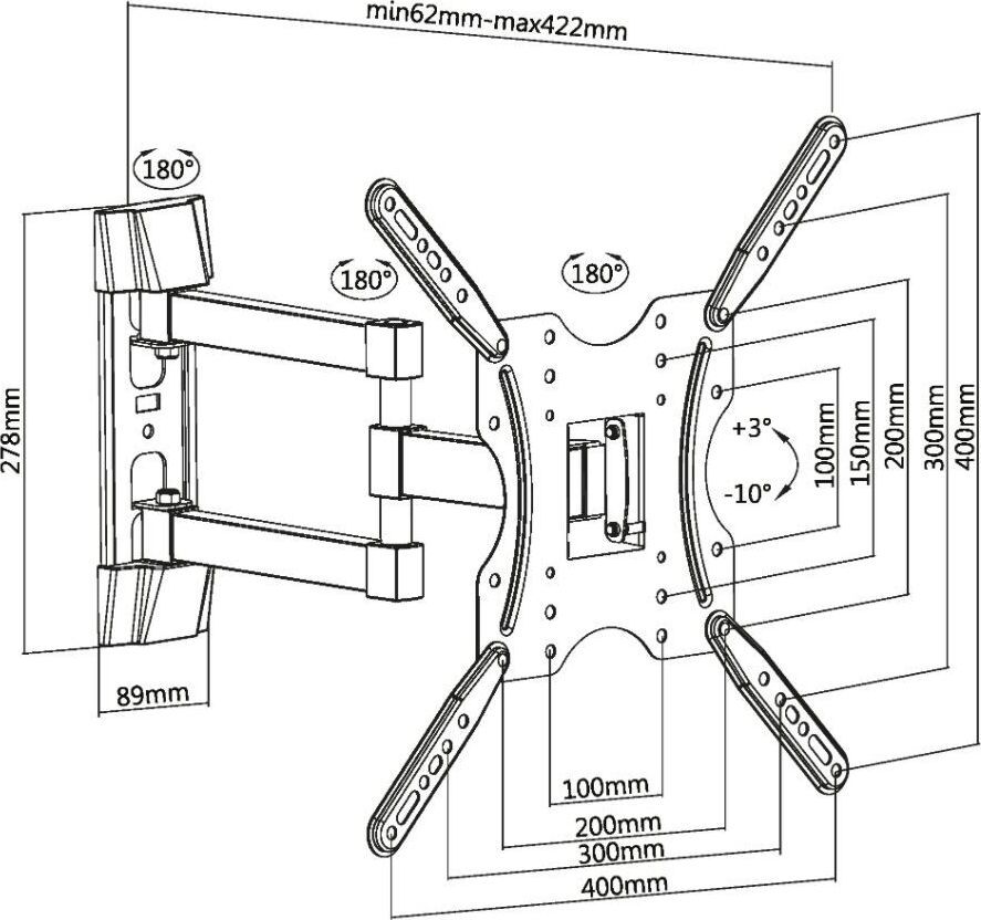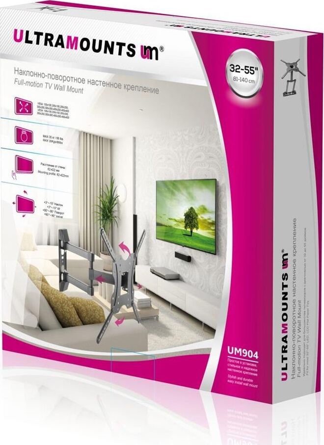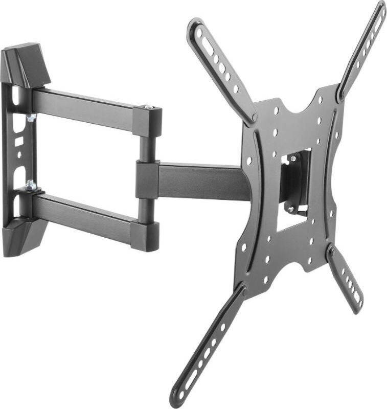 Диагональ экрана: 32"-55". VESA: 100x100, 200x100, 200x200, 300x200, 300x300, 400x200, 400x400. Максимальная нагрузка: 30 кг. Расстояние от стены: 62~422 мм. Угол поворота: +90°~-90°. Угол наклона: +3°~-10°. Материал: холоднокатаная сталь. Движение по нескольким осям обеспечивает максимальную гибкость - можно наклонять и поворачивать телевизор для удобного просмотра с любого места в комнате. Открытый дизайн обеспечивает лучшую вентиляцию и более легкий доступ к проводам.