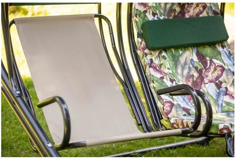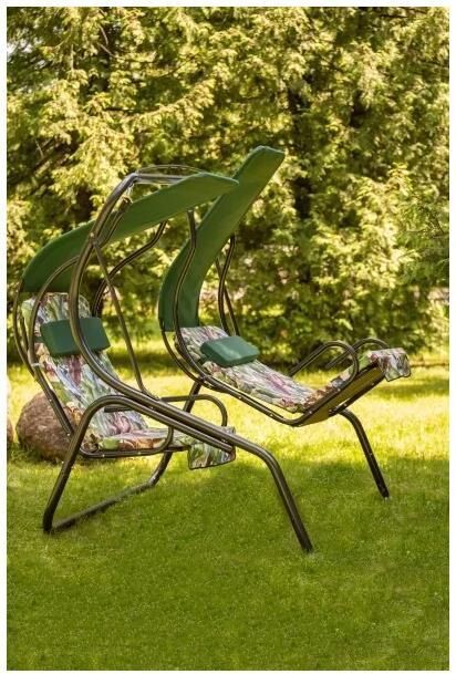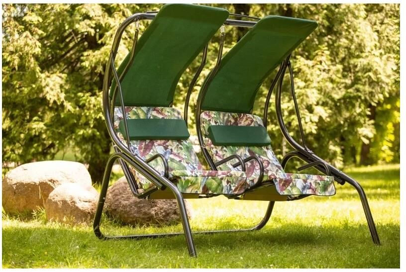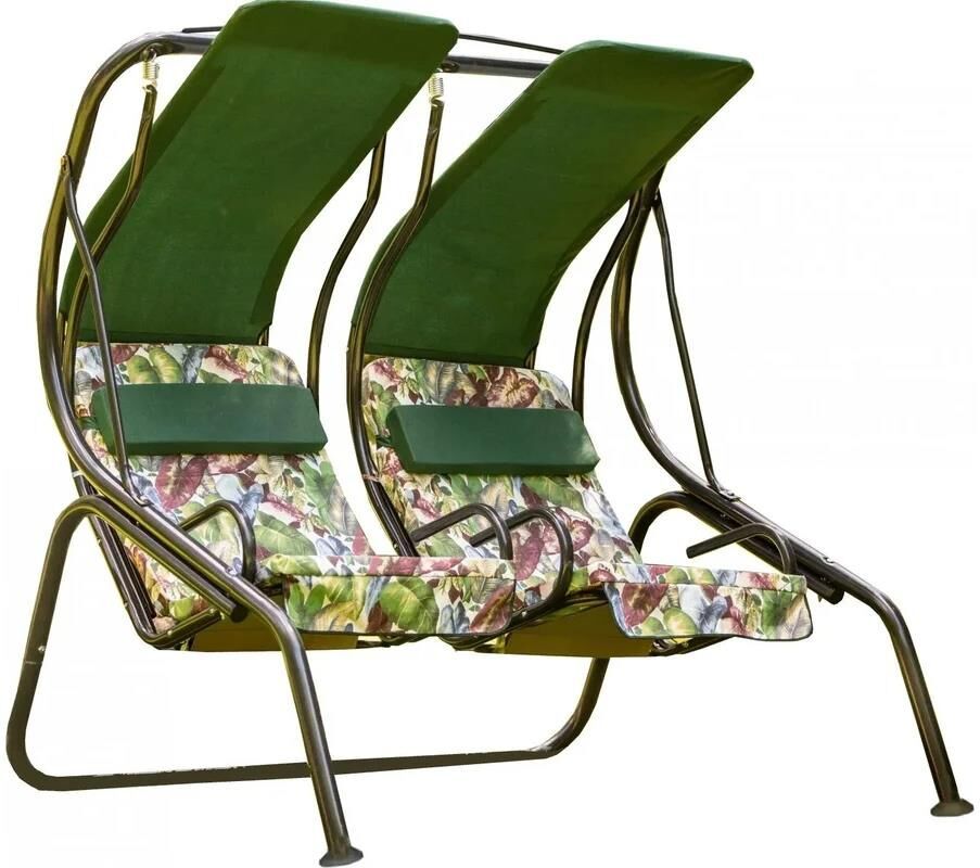 Габаритные размеры изделия (длина х ширина х высота), мм: 1910 х 1427 х 1892. Габаритные размеры сиденья,спинки и тента (длина х ширина), мм: размеры сиденья: 670x510. размеры спинки: 670x815. размер тента: 618х1180. Максимальная нагрузка, кг: 280 (не более 140кг на одно посадочное место). Каркас: труба стальная O51х1,4мм; полимерное покрытие . Мягкий элемент: ткань 40% п/э – 60% хлопок, плотность 220-230г/м2, наполнитель мягкого элемента поролон (толщиной 50 мм), наполнитель подголовника – формовой поролон. Тент: ткань 40% п/э – 60% хлопок, плотность 220-230г/м2. Размеры упаковки, мм: 850х200х1880. Вес изделия: нетто, кг – 47,2.