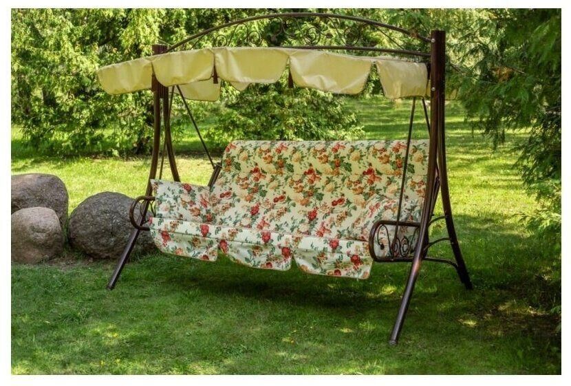 Габаритные размеры сиденья и спинки (длина х ширина), мм: размеры сиденья: 1785х840 размеры спинки: 1785х540 размеры тента: 2110х1450 Максимальная нагрузка, кг: 280. Каркас с элементами декора: труба стальная O 51х1,4мм; полимерное покрытие; элементы декора могут быть изменены по усмотрению производителя Мягкий элемент: ткань 40% п/э 60% хлопок, плотность 220-230 г/м2, наполнитель мягкого элемента поролон (толщиной 80 мм). Увеличенная высота спинки сиденья. Наполнитель подголовника – формовой поролон. Подушки – 2шт. (наполнитель – синтепон) Тент: ткань с водоотталкивающей отделкой 100% п/э плотность 125-130г/м2, декор кисточками.