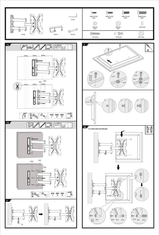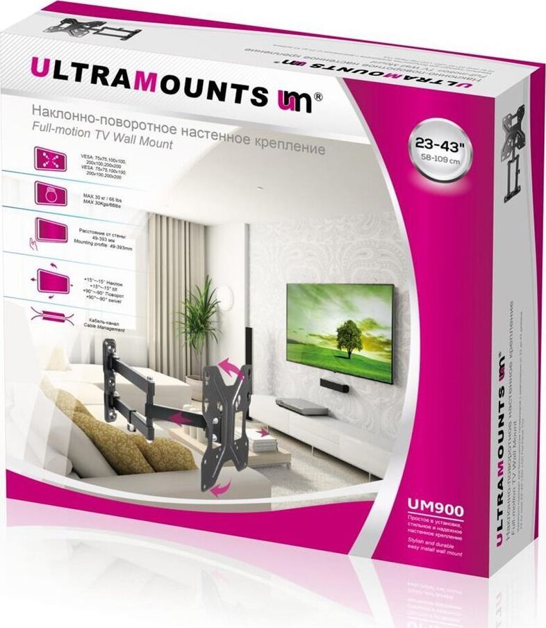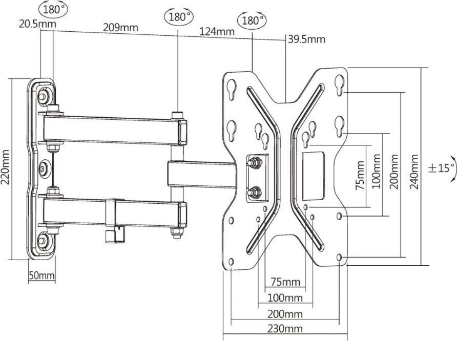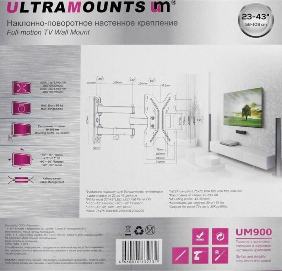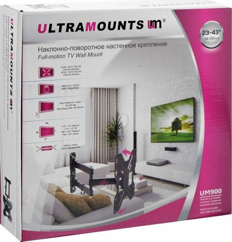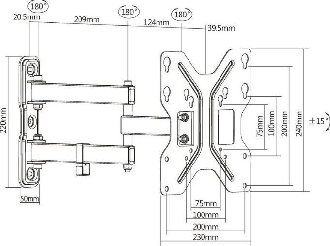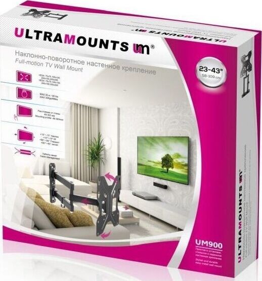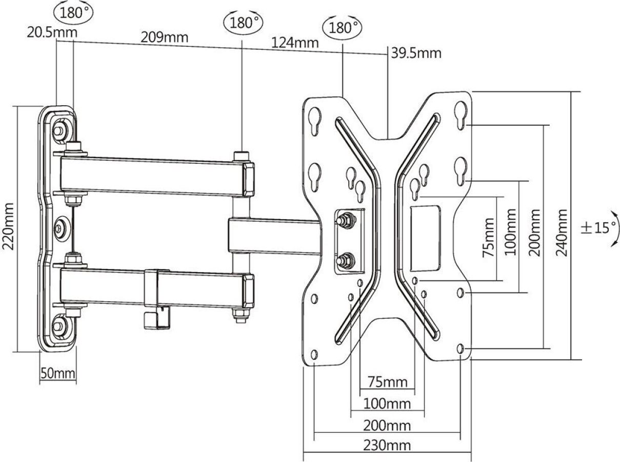 Диагональ экрана: 23"-43". VESA: 75x75, 100x100, 200x100, 200x200. Максимальная нагрузка: 30 кг. Расстояние от стены: 49~393 мм. Угол поворота: +90°~-90°. Угол наклона: +15°~-15°. Материал: холоднокатаная сталь. Конструкция с возможностью свободного наклона: просмотр будет комфортным из любой точки в комнате. Кабель-канал поможет навести порядок в проводах, подключенных к телевизору.