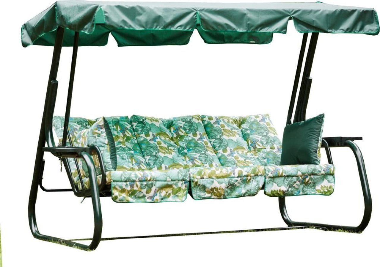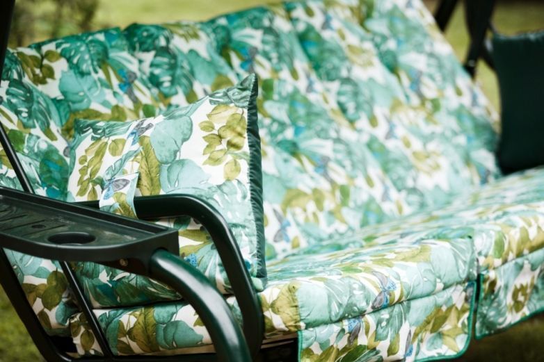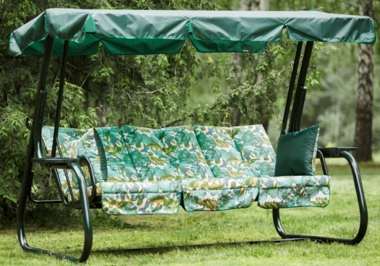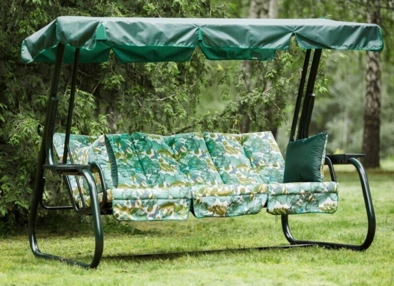Максимальная нагрузка, кг: 280. Каркас: труба стальная O 51х1,4мм; полимерное покрытие; полка - 2 шт. Мягкий элемент: ткань 40% п/э – 60% хлопок, плотность 220-230г/м2, наполнитель мягкого элемента поролон + синтепон общей толщиной 80мм. Увеличенная высота спинки сиденья. Декор мягкого элемента тафтингом. Подушки – 2шт.(наполнитель – синтепон). Тент: ткань с водоотталкивающей отделкой 100% п/э 125-130г/м2. Регулировка спинки: осуществляется звеньями цепи на требуемый угол наклона, с возможностью фиксации в разложенном положении.