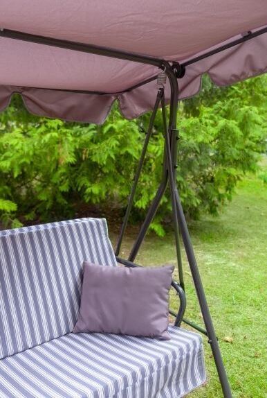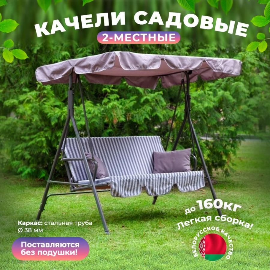 Максимальная нагрузка, кг: 160.Каркас: труба стальная O38х1,2мм; дуга опорная - O32х1,4ммполимерное покрытие. Мягкий элемент: ткань 45% п/э 55% хлопок, плотность 108-111г/м2, наполнитель мягкого элемента аэрофом 50мм, Основание сидения ткань полипропиленовая. Внимание: подушки в комплект поставки не входят Тент: ткань с водоотталкивающей отделкой 100% п/э плотность 120г/м2