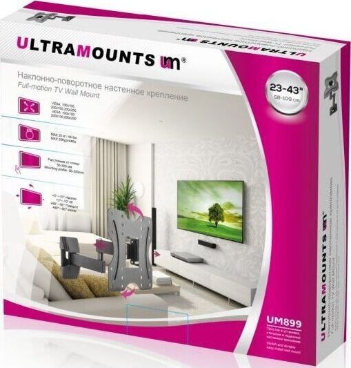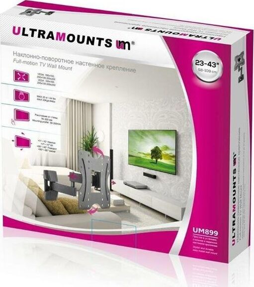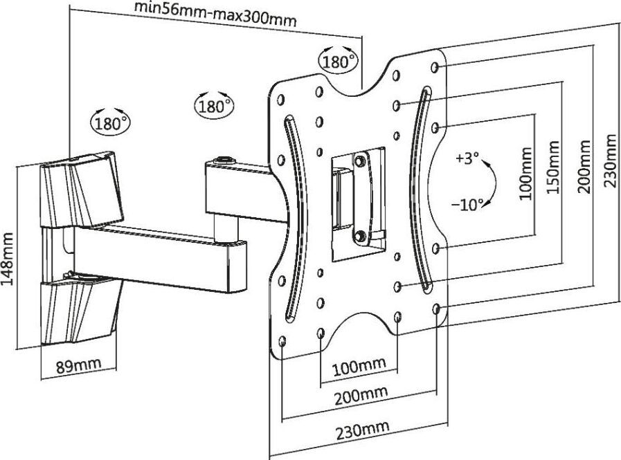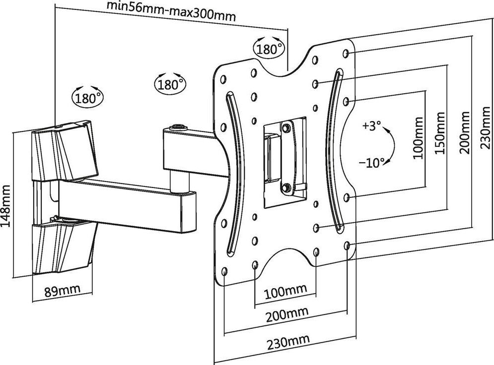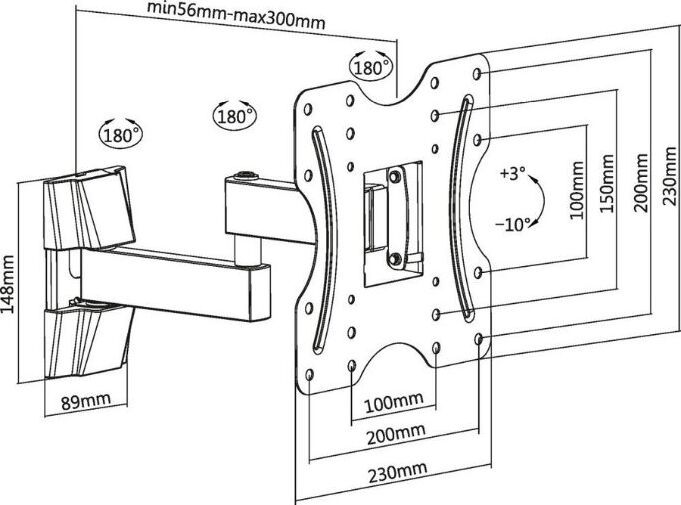 Диагональ экрана: 23"-43". VESA: 100x100,200x100,200x200. Максимальная нагрузка: 20 кг. Расстояние от стены: 56~300 мм. Угол поворота: +90°~-90°. Угол наклона: +3°~-10°. Материал: холоднокатаная сталь. Открытая архитектура обеспечивает лучшую вентиляцию и более легкий доступ к проводам. Движение по нескольким осям обеспечивает максимальную гибкость - можно наклонять и поворачивать телевизор для удобного просмотра с любого места в комнате.