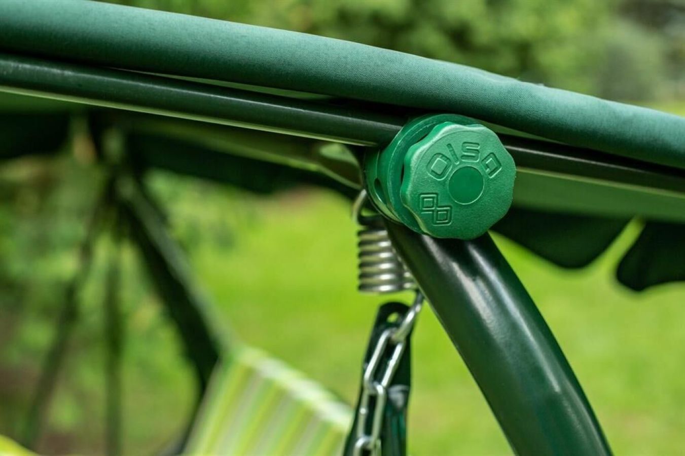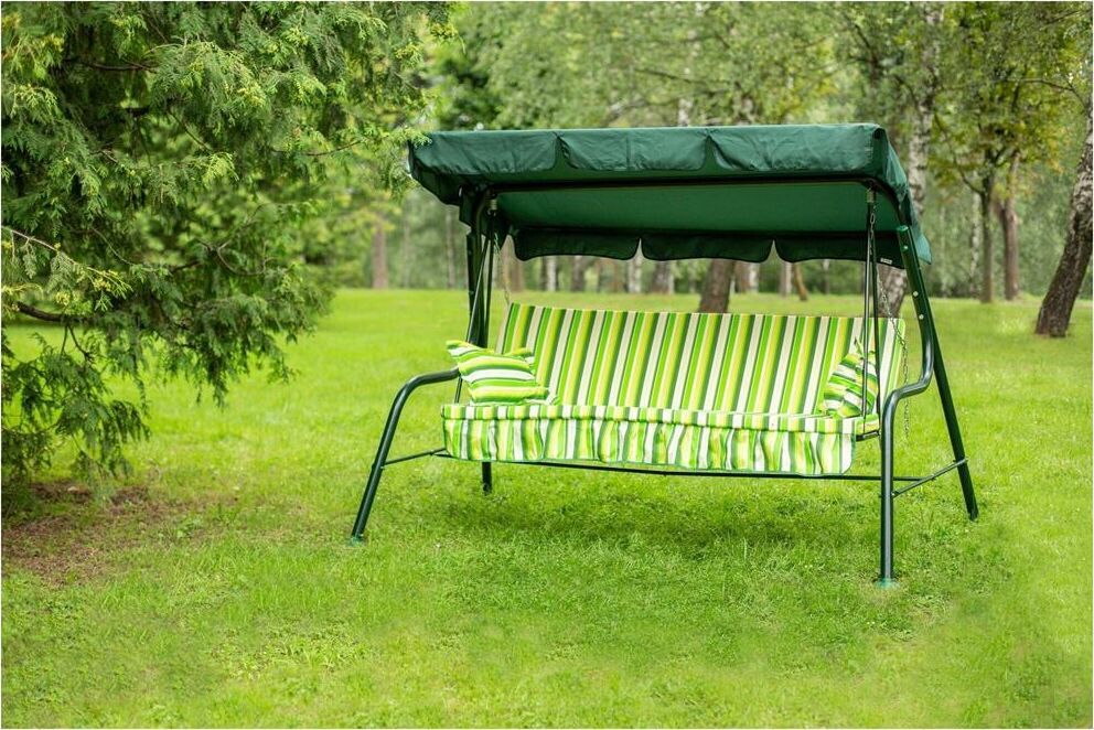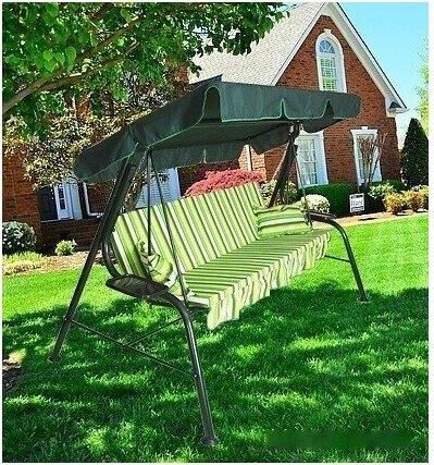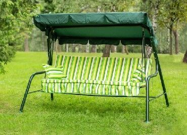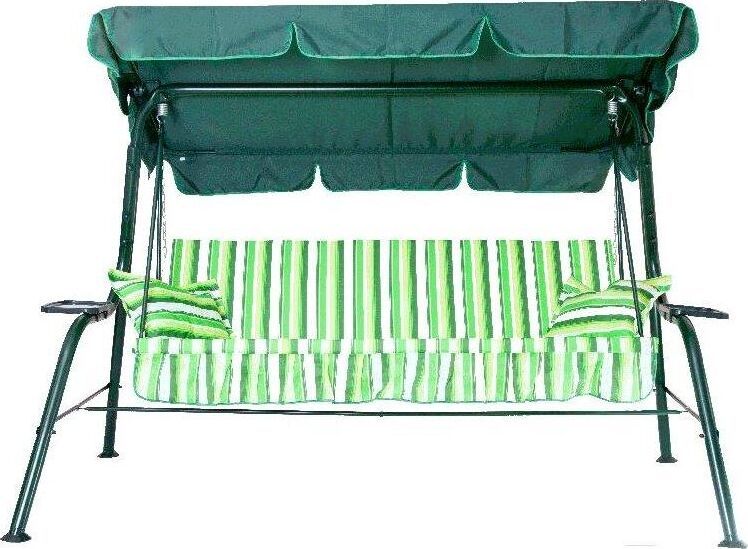 Габаритные размеры изделия (ДхШхВ) 2310х1260х1478 мм, размеры сиденья,спинки и тента (ДхШ) размеры сиденья: 1706х497 мм, размеры спинки: 1706х497 мм, размер тканевого тента: 1840х1020 мм, Максимальная нагрузка 210 кг, Каркас: труба стальная Ф45х1,4мм; полимерное покрытие; полка - 2 шт. Мягкий элемент: ткань 45% п/э – 55% хлопок, плотность 108-111г/м2, наполнитель мягкого элемента (листовой поролон 50мм), наполнитель подушек (крошка поролона). Подушки – 2шт. Тент: ткань с водоотталкивающей отделкой 100% п/э плотность 120г/м2. Регулировка спинки: осуществляется звеньями цепи на требуемый угол наклона. .Размеры упаковки: 526х186х1966 мм, Вес изделия: нетто 35,2 кг.