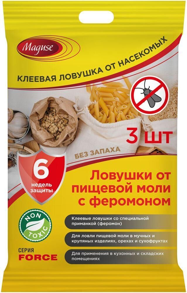 Клеевая ловушка от пищевой моли с феромоном Клеевая ловушка 6ез запаха с феромоном, для отлова пищевой моли и других вредителей пищевых 3апасов. Благодаря сексуальной приманке мужские осо6и пищевой моли привлекаются на ловушку и крепко приклеиваются к ее поверхности. Таким о6ра3ом, прекращается ра3мношение моли, что 6ыстро приводит к сокращению ее количества. Hе содержит токсичных веществ, поэтому может 6ыть исполь3ована на кухнях, кладовках или складских помещениях, а также непосредственно в шкафах с продуктами питания, таких как крупы, мука, макаронные и3делия, хлопья, кофе, чай, какао, сухофрукты и др.