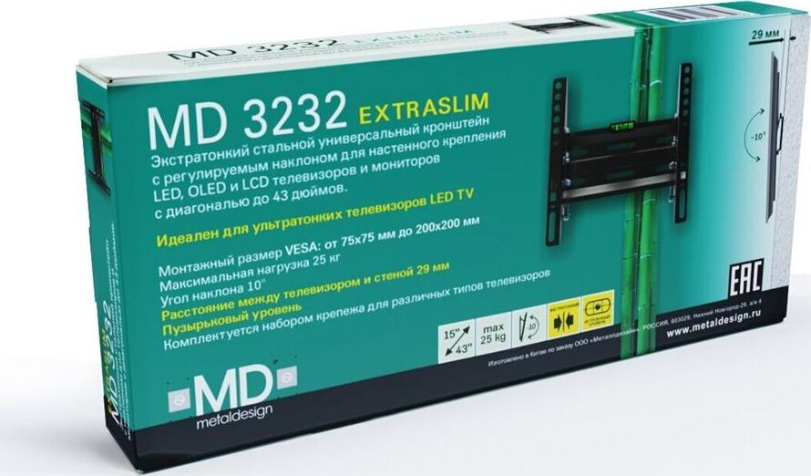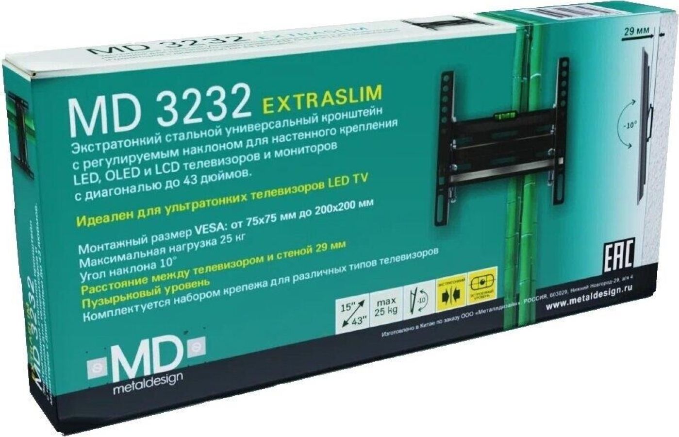 Тип кронштейна Наклонный. Крепежные отверстия (VESA) 75x75 - 200x200. Мин. диагональ экрана (дюймы) 15. Макс. Диагональ экрана (дюймы) 43. Максимальная нагрузка, (кг.) 25. Угол наклона (°) 10. Расстояние от стены (мм.) 29. Цвет кронштейна Черный. Комплектация Кронштейн, набор крепежа, инструкция.