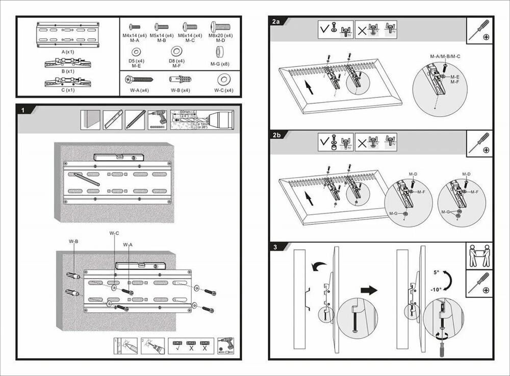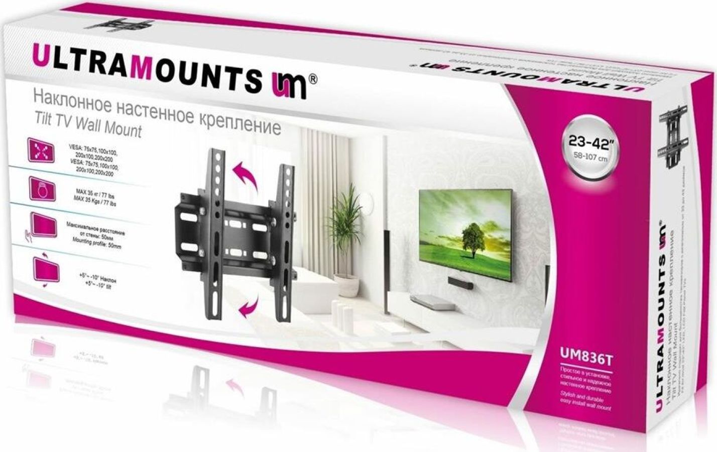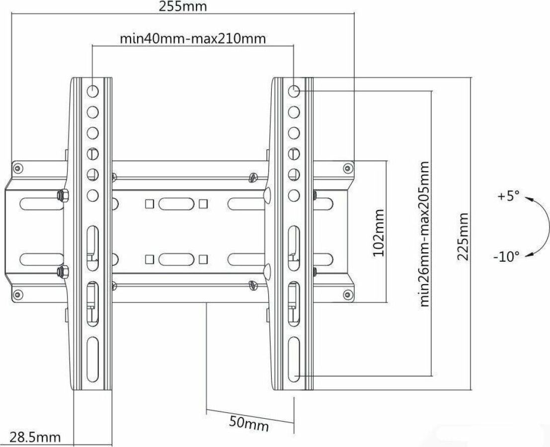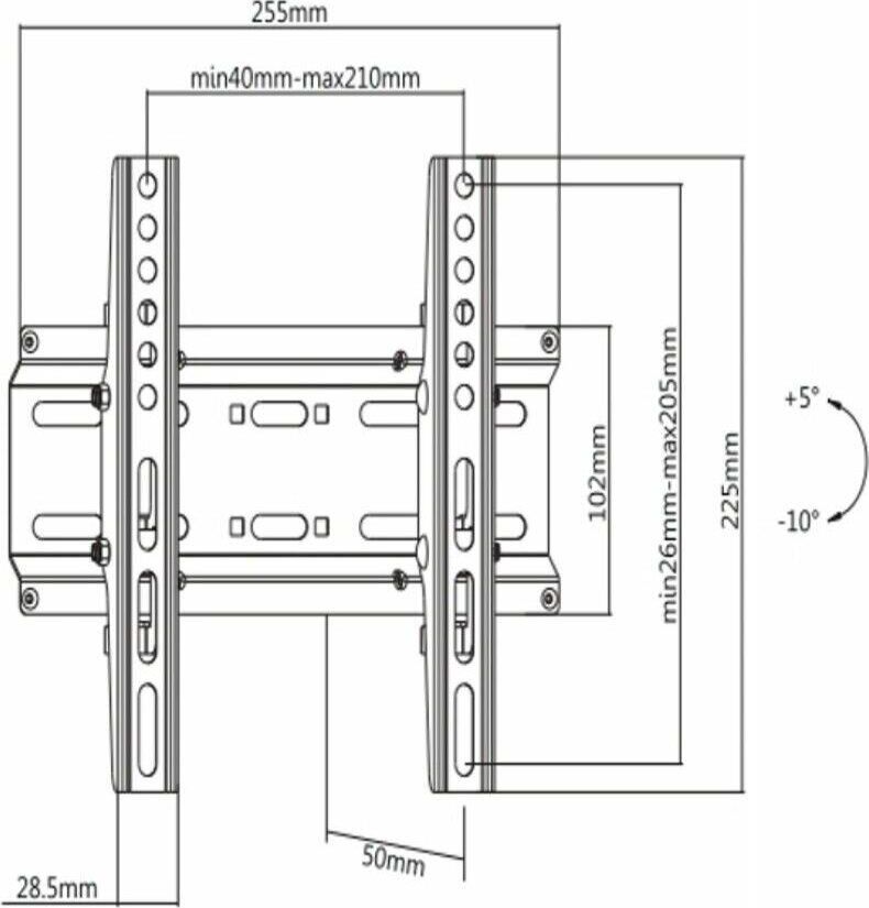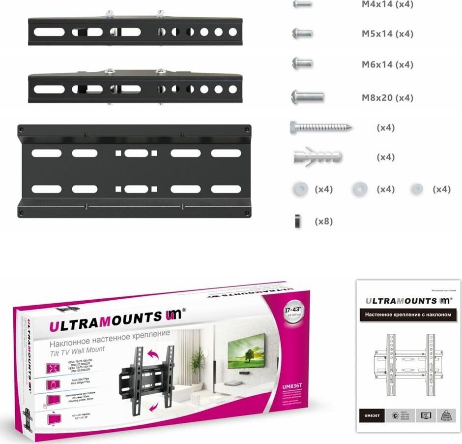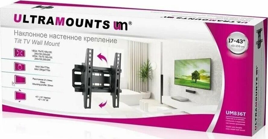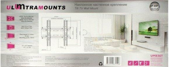 Материал: холоднокатаная сталь. Протестировано весом в 3 раза больше. Можно перемещать вправо-влево. Угол наклона свободно регулируется. Легко устанавливается. Диагональ экрана: 17"-43". VESA: 75x75, 100x100, 200x100, 200x200. Нагрузка: до 35 кг. Угол наклона: +5°~-10°.