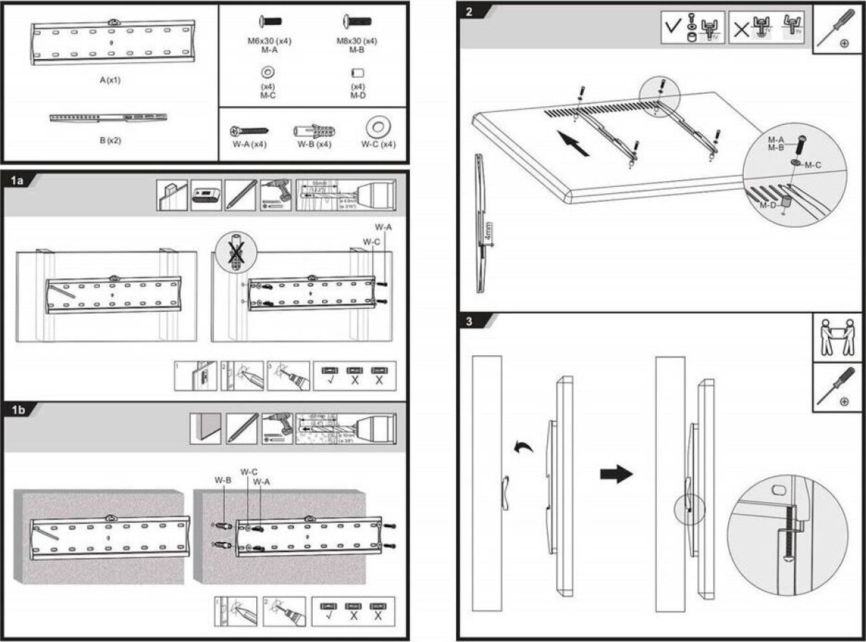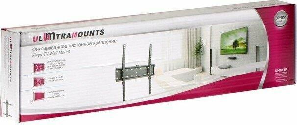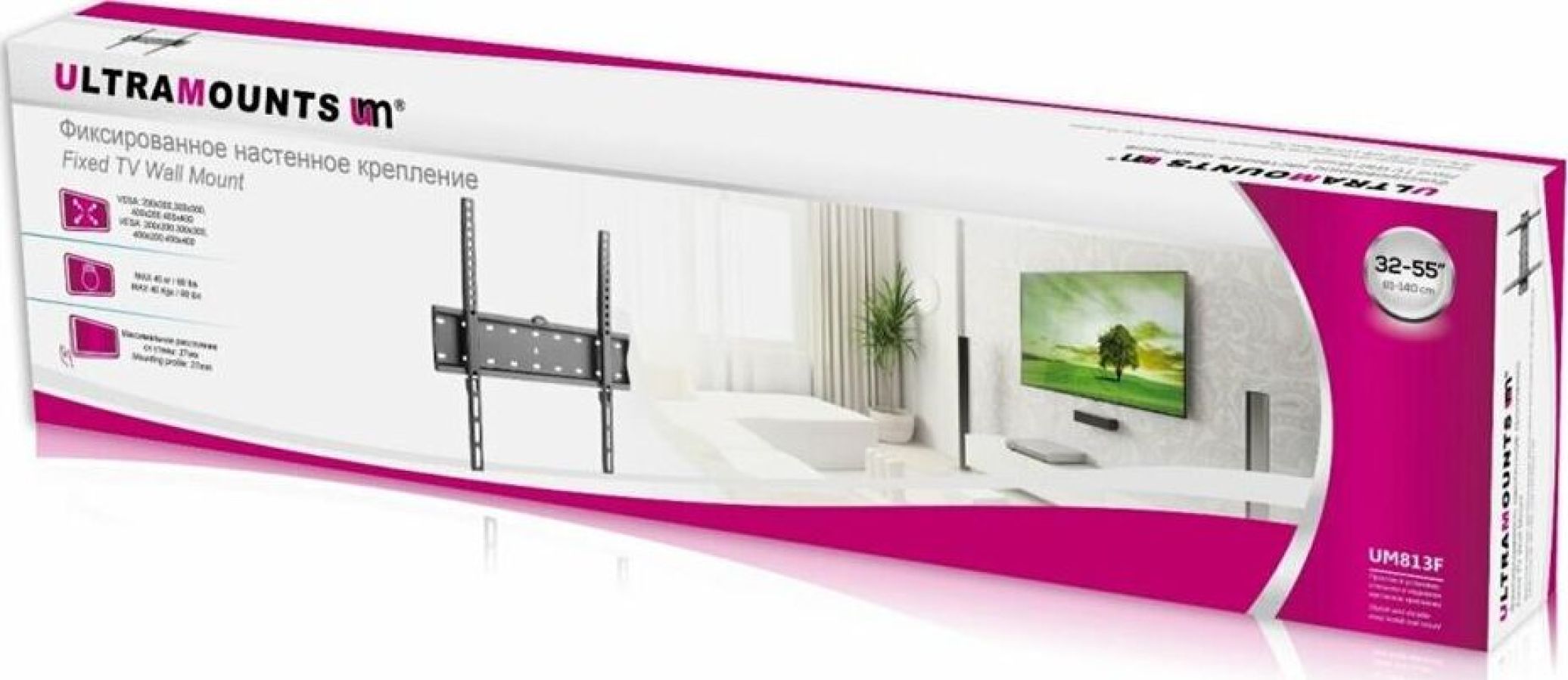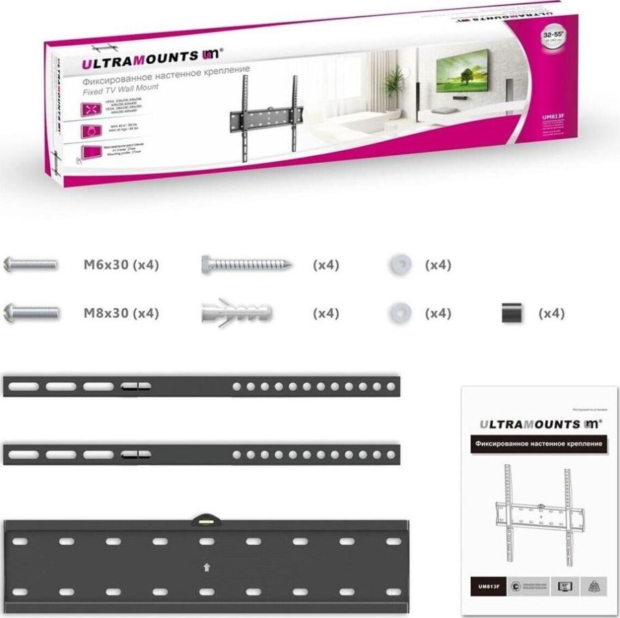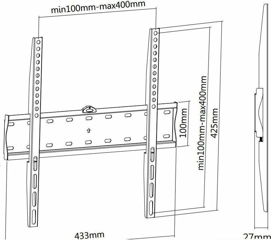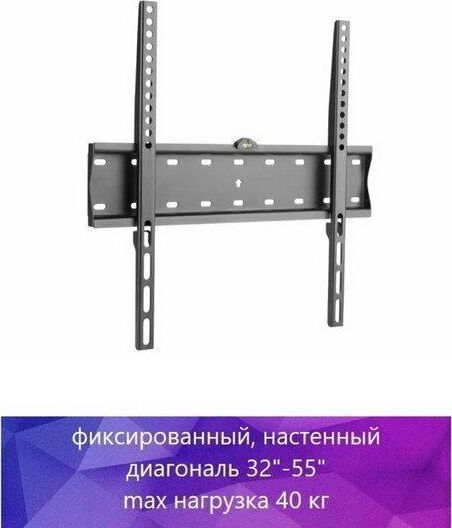Диагональ экрана: 32"-55". Подходит для изогнутых телевизоров. VESA: 200x200, 300x300, 400x200, 400x400. Максимальная нагрузка: 40 кг. Расстояние от стены: 27 мм. Материал: холоднокатаная сталь. Протестировано весом в 3 раза больше. Встроенный уровень. Простое в установке стильное и надёжное крепление.