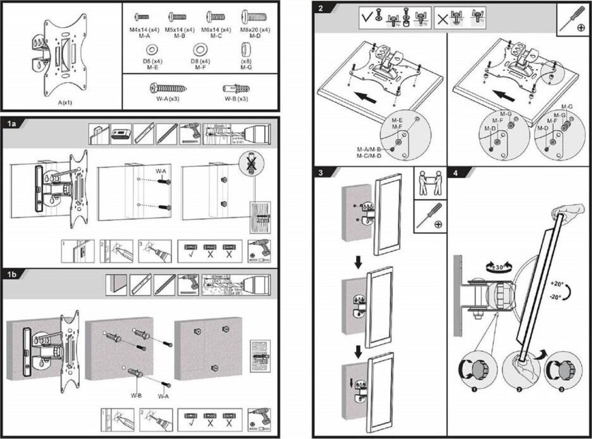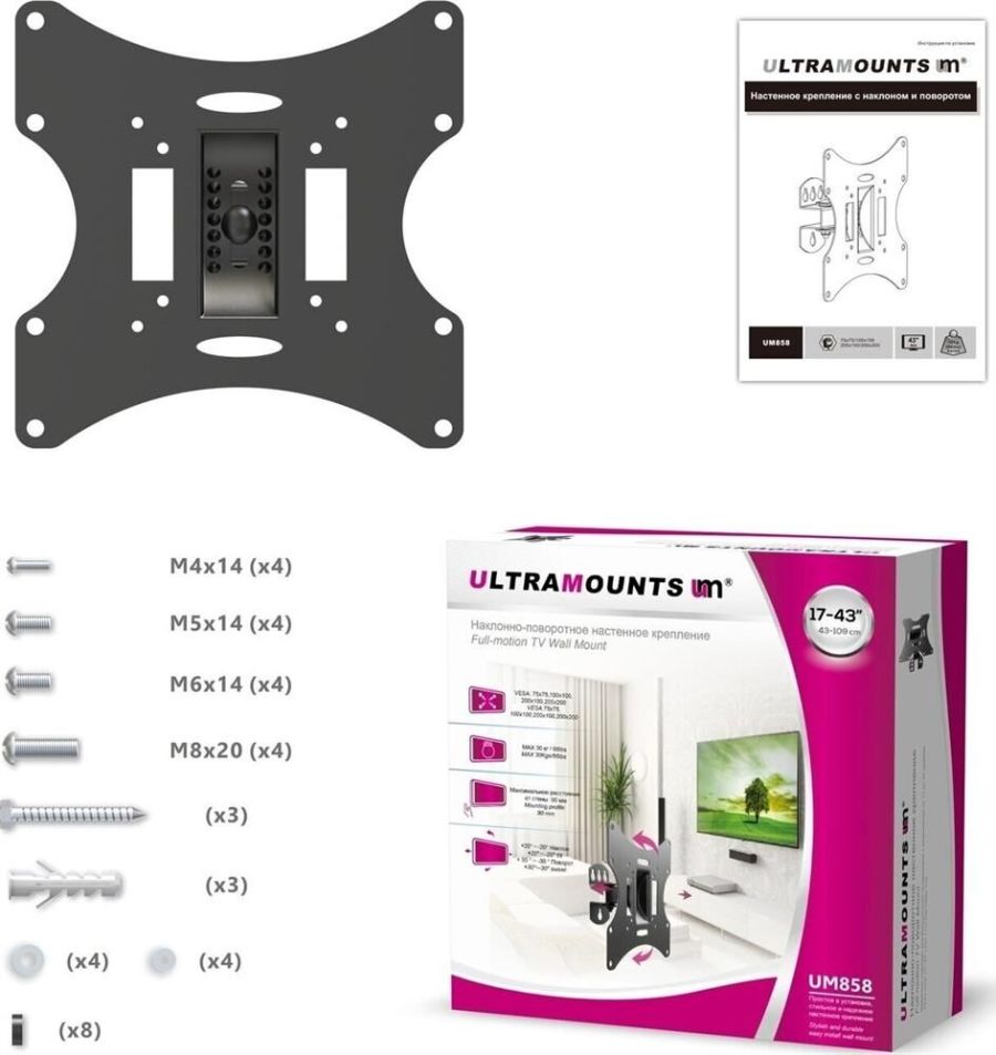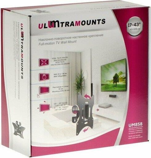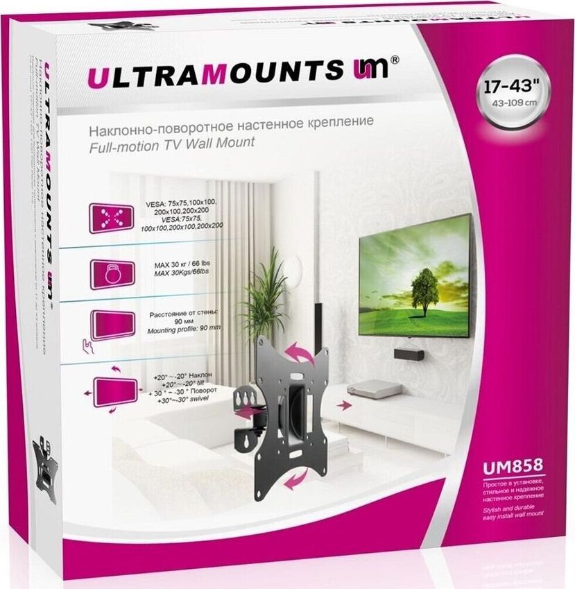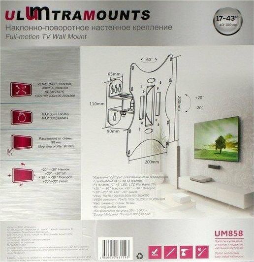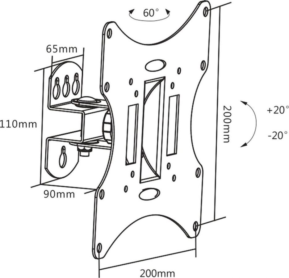 Диагональ экрана: 17"-43". * Подходит для изогнутых телевизоров. VESA: 75x75, 100x100, 200x100, 200x200. Максимальная нагрузка: 30 кг. Расстояние от стены: 90 мм. Угол поворота: +30°~-30°. Угол наклона: +20°~-20°. Материал: холоднокатаная сталь. Классический надёжный кронштейн с функциями поворота и наклона. Удобная регулировка угла наклона и фиксация экрана. Простая долговечная конструкция.
