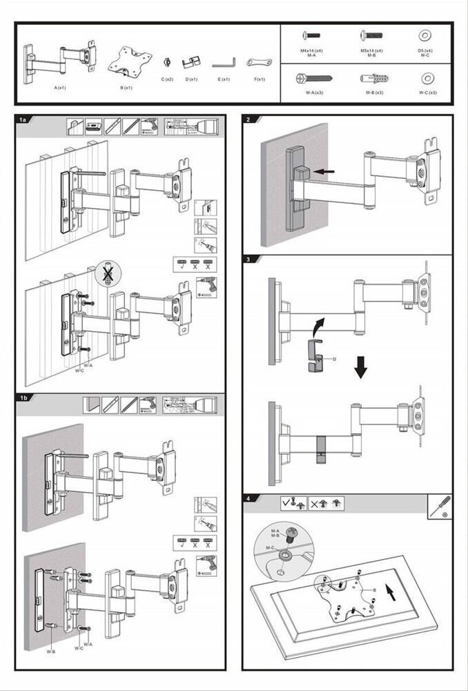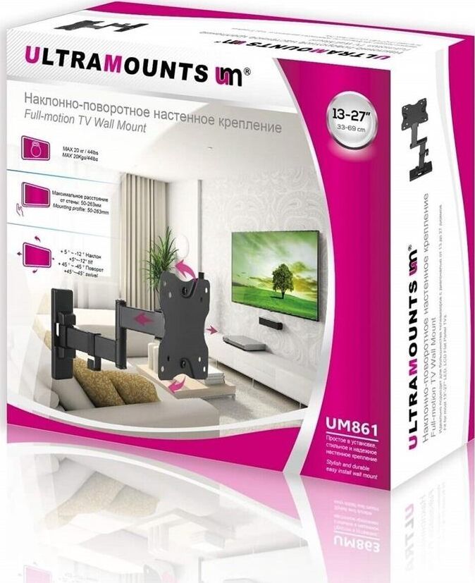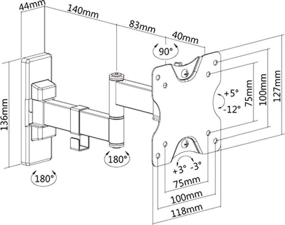 Диагональ экрана: 13"-27". VESA: 75x75, 100x100. Максимальная нагрузка: 20 кг. Расстояние от стены: 50-263 мм. Угол поворота экрана: +45°~-45°. + 2 шарнирных соединения (колена). с углом поворота 180°. Угол наклона: +5°~-12°. Горизонт экрана: +3°~-3°. Материал: холоднокатаная сталь, пластик. Протестировано весом в 2 раза больше максимально допустимого. Плавно и легко наклоняется и поворачивается на шарнирах. Встроенная регулировка уровня и индикатор поворота. Конструкция панели с VESA съёмная для лёгкой установки.