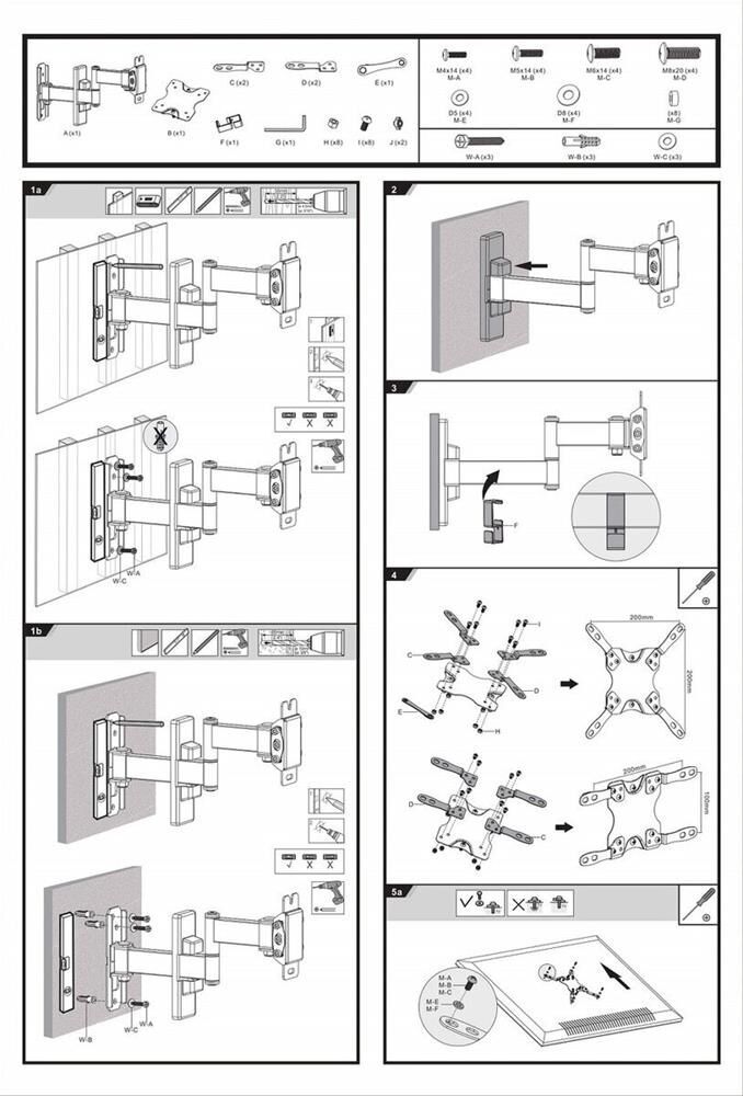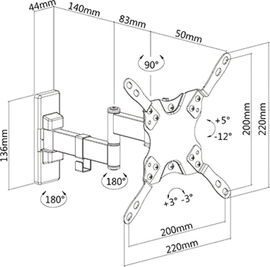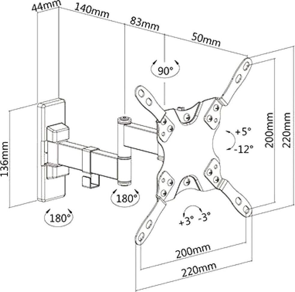 Диагональ экрана: 13"-43". Подходит для изогнутых телевизоров. VESA: 75x75, 100x100, 200x100, 200x200. Максимальная нагрузка: 20 кг. Расстояние от стены: 60-273 мм. Угол поворота экрана: +45°~-45°. + 2 шарнирных соединения (колена). с углом поворота 180°. Угол наклона: +5°~-12°. Горизонт... подробнее