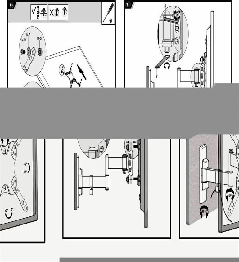 Диагональ экрана: 13"-43". Подходит для изогнутых телевизоров. VESA: 75x75, 100x100, 200x100, 200x200. Максимальная нагрузка: 20 кг. Расстояние от стены: 60-273 мм. Угол поворота экрана: +45°~-45°. + 2 шарнирных соединения (колена). с углом поворота 180°. Угол наклона: +5°~-12°. Горизонт экрана: +3°~-3°. Материал: холоднокатаная сталь, пластик. Протестировано весом в 2 раза больше максимально допустимого. Плавно и легко наклоняется и поворачивается. Конструкция свободного наклона. Встроенная регулировка уровня и индикатор поворота. Конструкция панели с VESA съёмная для лёгкой установки. Направляющая кабеля.