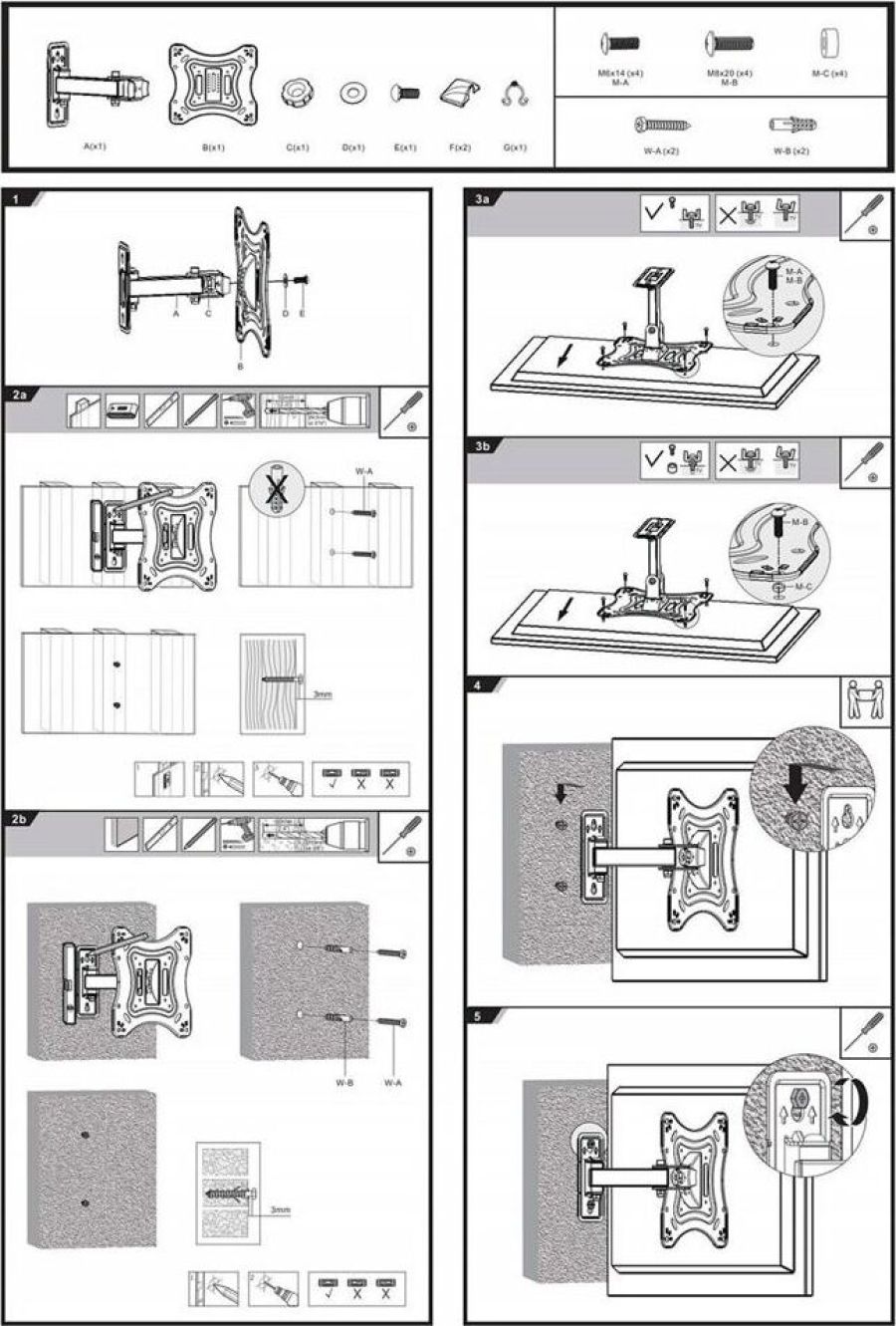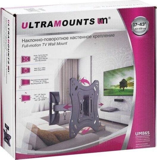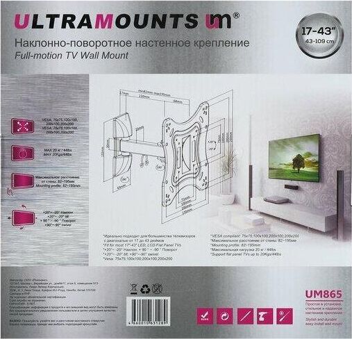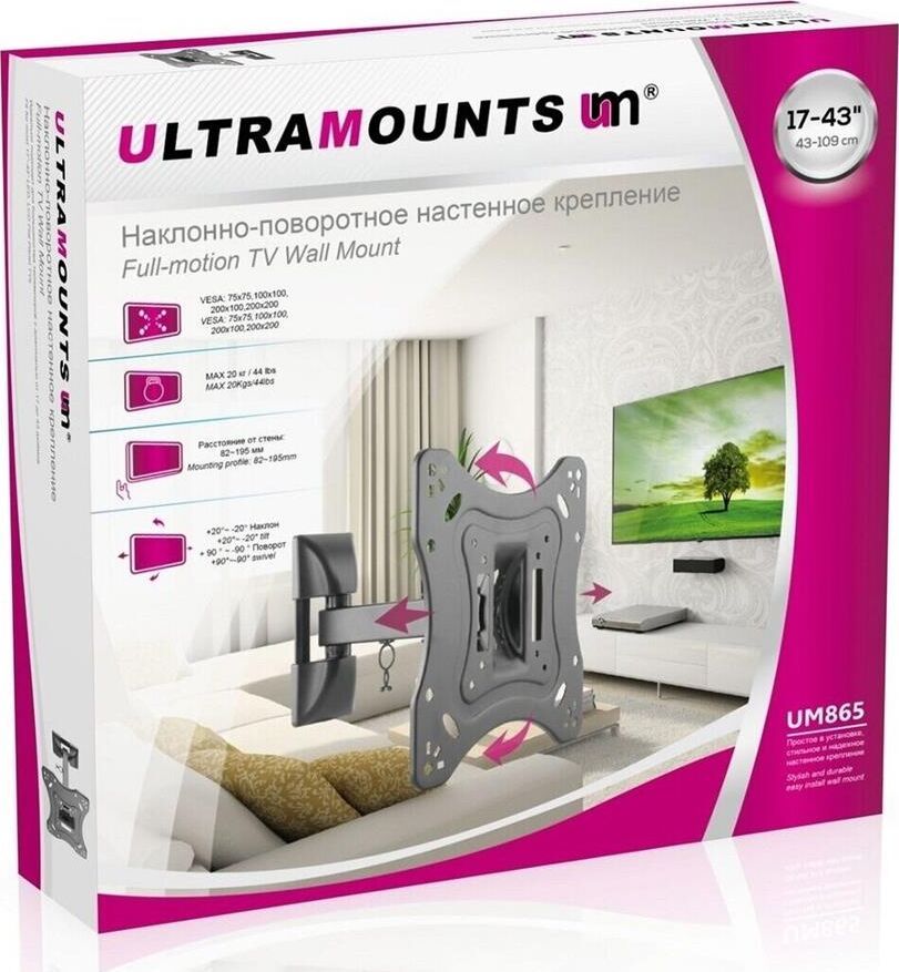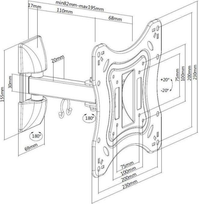 Диагональ экрана: 17"-43". VESA: 75x75, 100x100, 200x100, 200x200. Максимальная нагрузка: 20 кг. Расстояние от стены: 82-195 мм. Угол поворота: +90°~-90°. Угол наклона: +20°~-20°. Материал: холоднокатаная сталь. Протестировано весом в 2 раза больше максимально допустимого. Конструкция свободного наклона. Направляющая для кабелей.