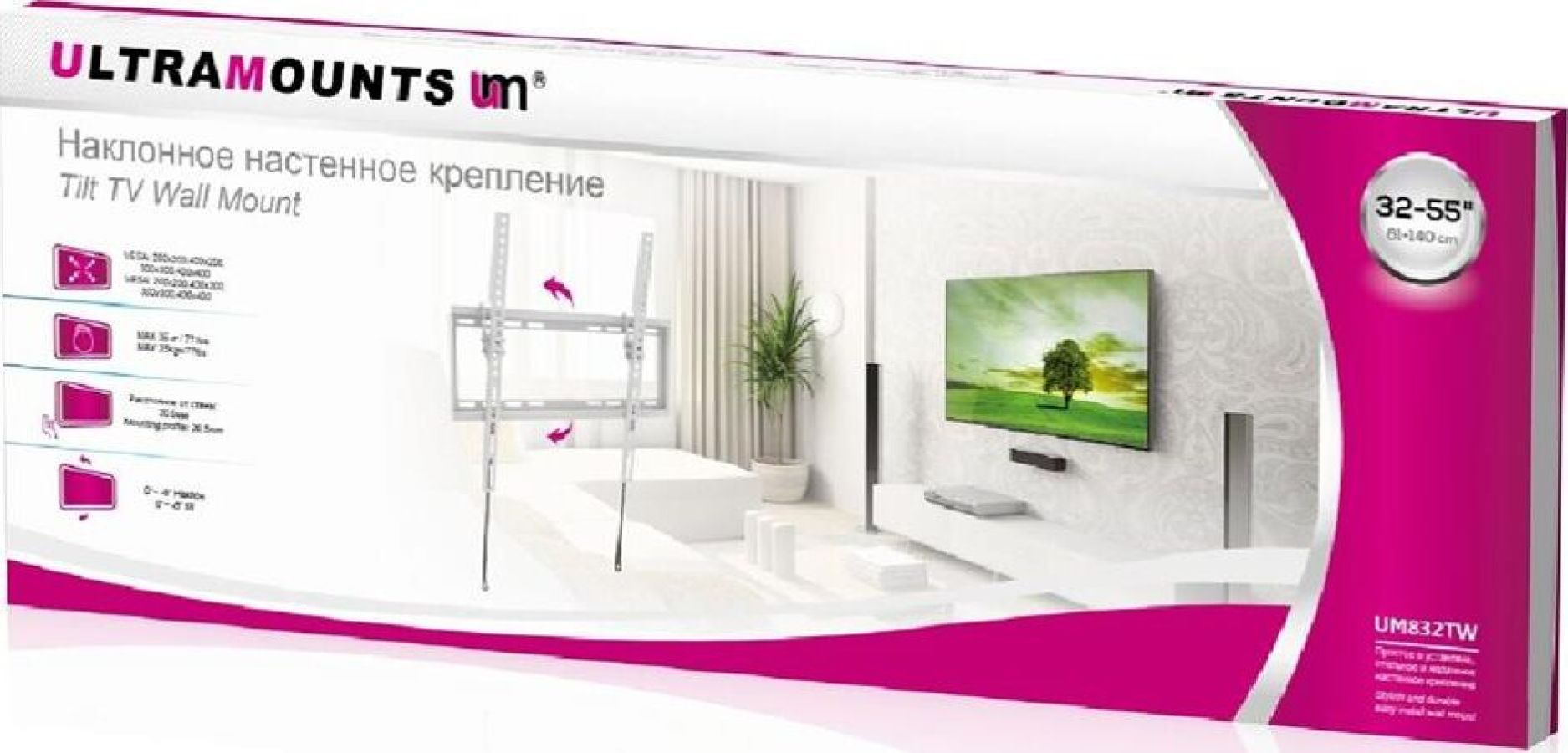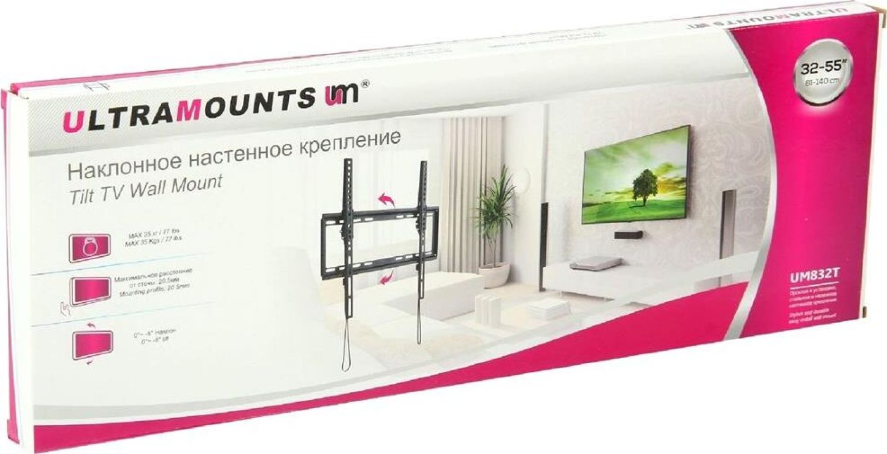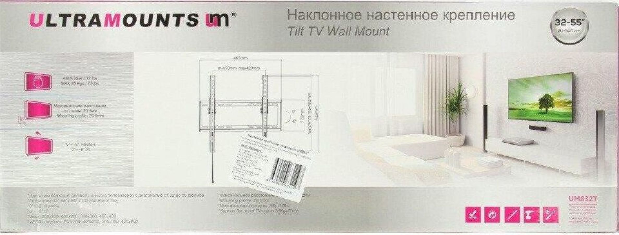 Диагональ экрана: 32"-55". VESA: 200x200, 300x300, 400x200, 400x400. Максимальная нагрузка: 35 кг. Расстояние от стены: 20,5 мм. Угол наклона: 0°~-8°. Материал: холоднокатаная сталь. Протестировано весом в 4 раза больше. Ультра-тонкий дизайн. Регулировка угла наклона. Открытая конструкция с улучшенной вентиляцией и облегчённым доступом к проводам. С помощью автоматических защёлок телевизор надёжно фиксируется на настенном крепеже и блокируется винтами.