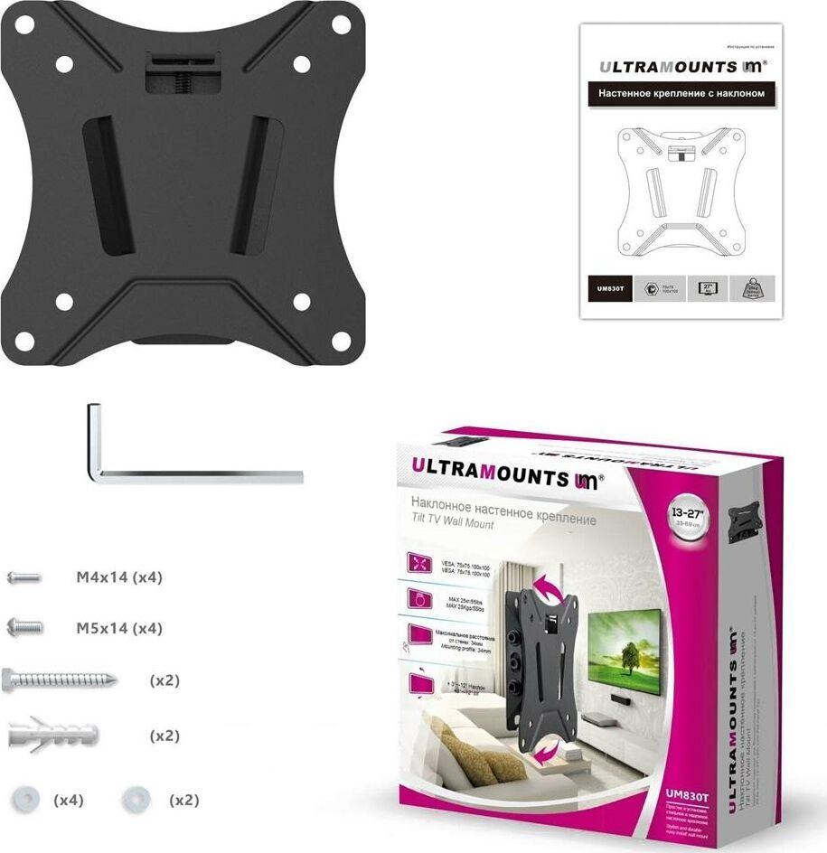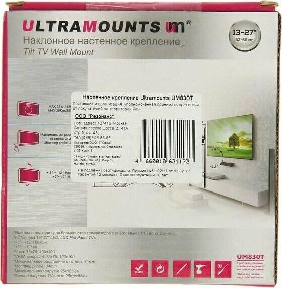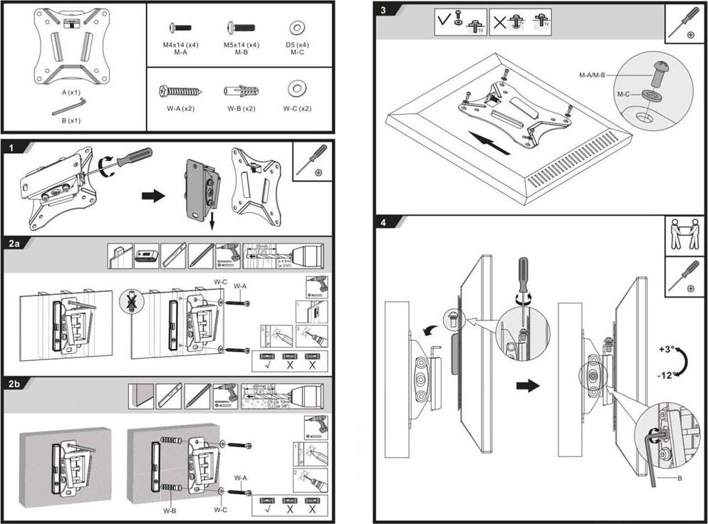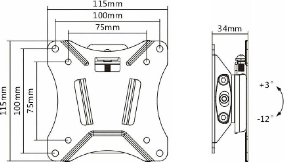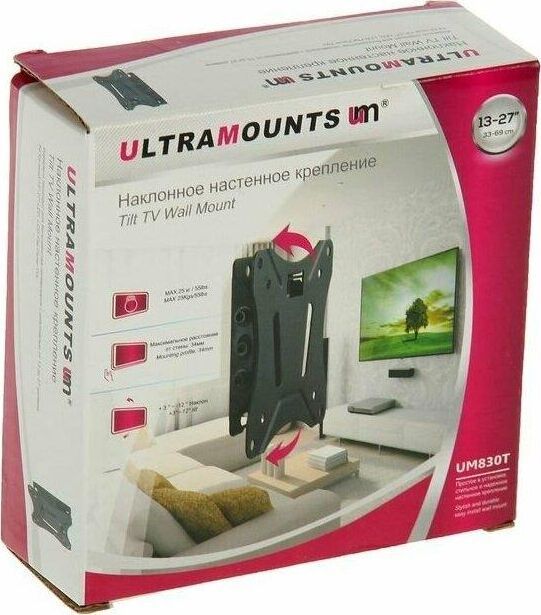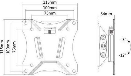 Наклонный. Диагональ экрана: 13"-27". VESA: 75x75, 100x100. Максимальная нагрузка: 25 кг. Расстояние от стены: 34 мм. Угол наклона: +3°~-12°. Материал: холоднокатаная сталь. Протестировано весом в 2 раза больше. Угол обзора легко регулируется без дополнительных инструментов. Простая конструкция легко устанавливается.