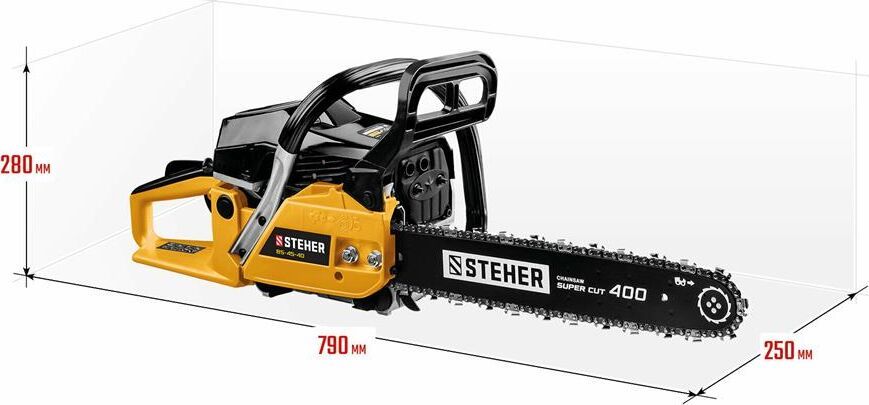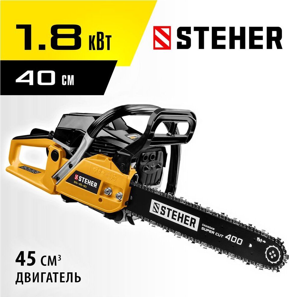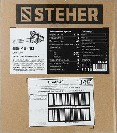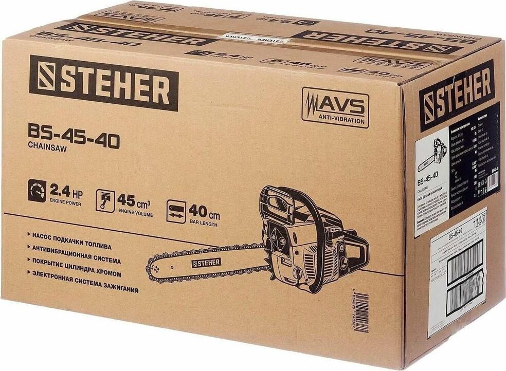 Комплект поставки: ключи, емкость для смешивани, зубчатый упор, инструкции по безопасности, направляющая цепи (шина), руководство по эксплуатации, цепь пильная, пила Steher BS-45-40, кожух защитный , Емкость топливного бака: 0.55 л , Емкость масляного бака: 0.26 л , Функции и возможности: антивибрация, тормоз цепи