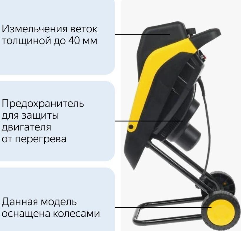 Мощность, Вт 2500. Напряжение, В/Гц 220-230 / 50. Номинальная скорость вращения без нагрузки, об/мин 4600. Максимальный диаметр измельчения, мм 40. Защита от перегрузки дa. Комплектация Блок измельчения - 1 шт. Рама с крепежом - 1 шт. Комплект колес с крепежом - 1 шт. Толкатель - 1 шт. Контейнер для мульчи: нет. Мешок для измельченного материала: да. Штрихкод EAN-13 4606059025511.