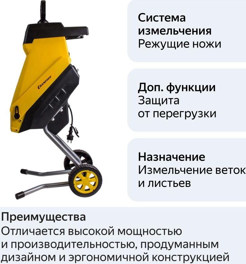 Измельчитель садовый Champion SH 251 - устройство для измельчения садового мусора, веток и т.д. с целью превращения его в компост. Удобный в использовании, мобильный, имеет малый вес. Преимущества: Небольшой вес и компактность. Защита двигателя от перегрузки. Удобство транспортировки. Толкатель и сумка для продуктов измельчения в комплекте. Характеристики Вес, кг 10,3 Диаметр измельчения максимальный, мм 40 Мощность, кВт 2,5 Напряжение сети, В/Гц 230/50 Номинальная скорость вращения без нагрузки, об/мин 4200 Тип двигателя Электрический Уровень мощности звука, дБ 106
