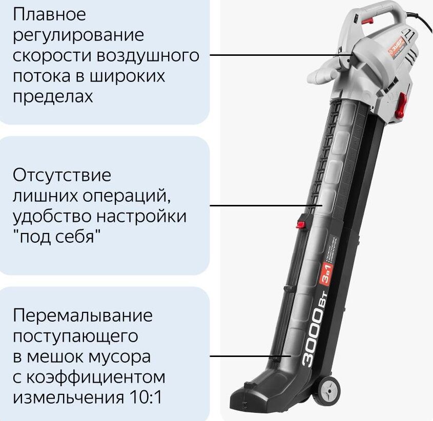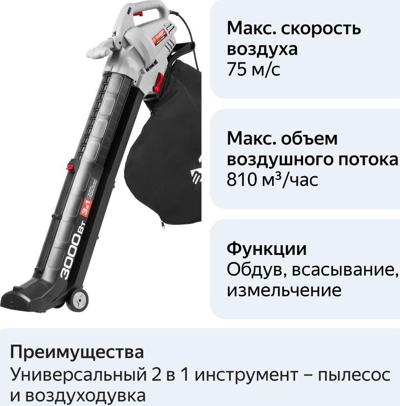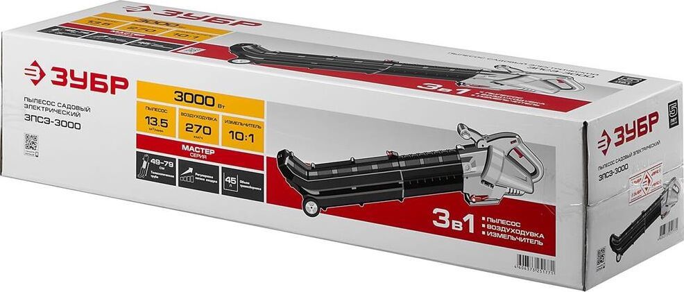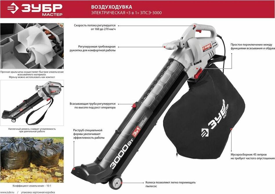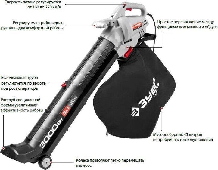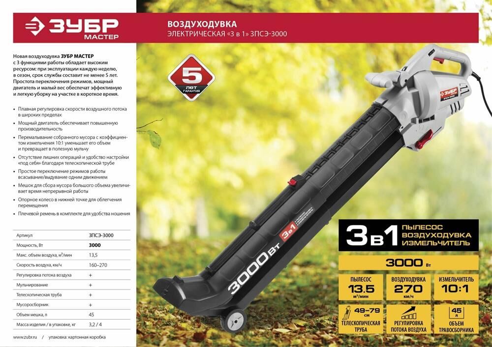 Мощность, Вт 3000 Макс. скорость воздуха, м/с 75 Макс. объем воздуха, м³/ч 810 Функции всасывание, выдувание, измельчение Регулировка потока воздуха есть Мусоросборник есть Объем мусоросборника, л 45 Длина провода, м 0.4