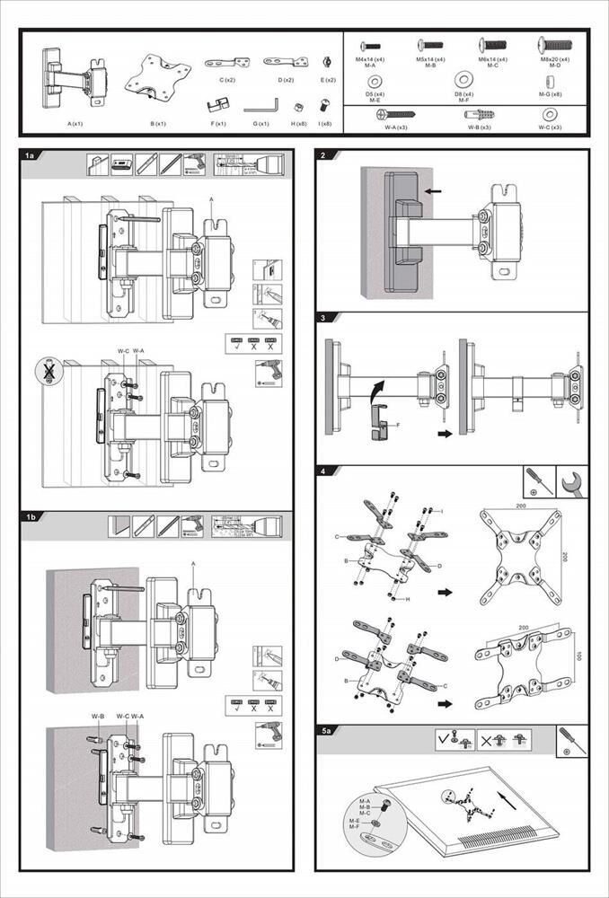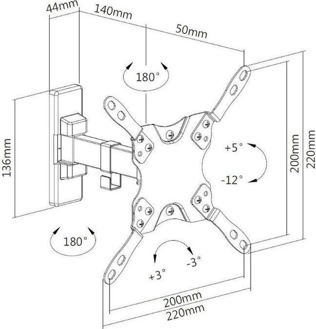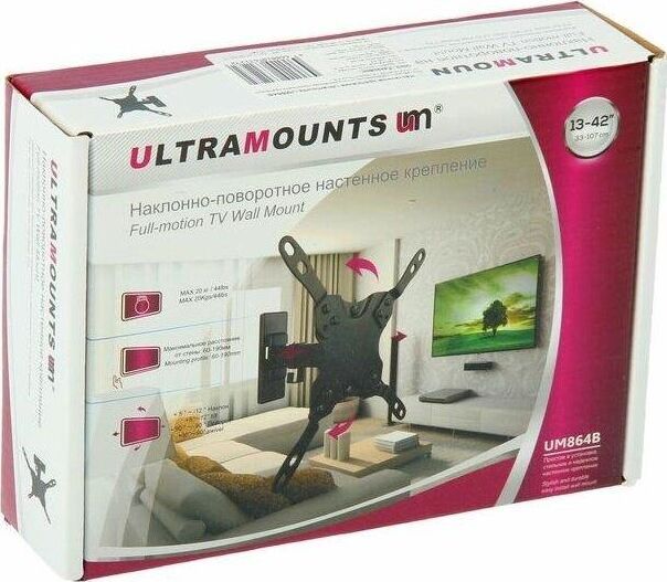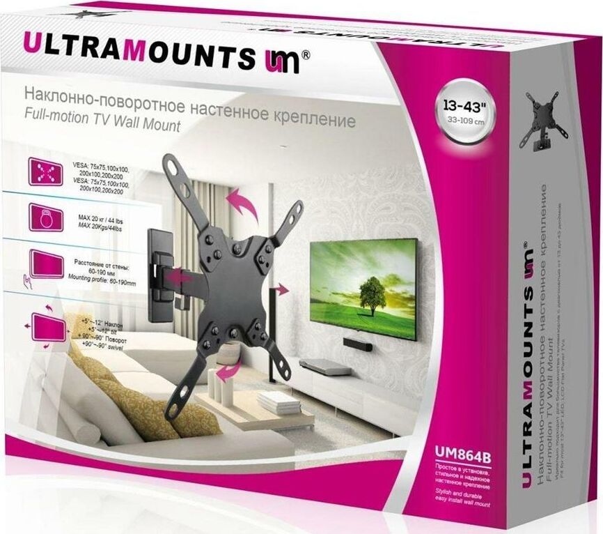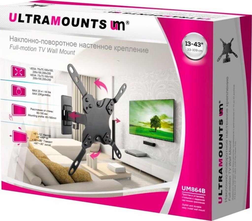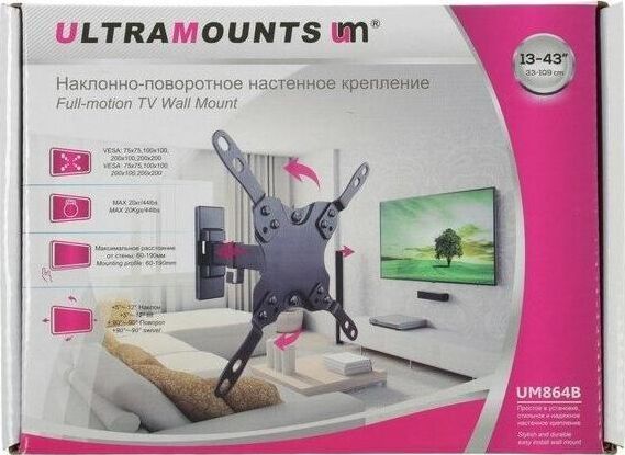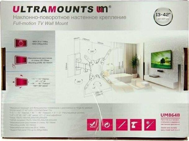 Диагональ экрана: 13"-43". * Подходит для изогнутых телевизоров. VESA: 75x75, 100x100, 200x100, 200x200. Максимальная нагрузка: 20 кг. Расстояние от стены: 60-190 мм. Угол поворота: +90°~-90°. Угол наклона: +5°~-12°. Горизонт экрана: +3°~-3°. Материал: холоднокатаная сталь, пластик. Протестировано весом в 2 раза больше максимально допустимого. Плавно и легко наклоняется и поворачивается. Конструкция свободного наклона. Встроенная регулировка уровня и индикатор поворота. Конструкция панели с VESA съёмная для лёгкой установки. Направляющая кабеля.