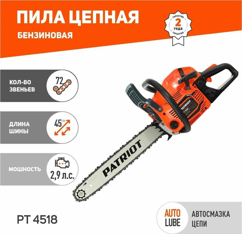 Объем двигателя, см3 45, Макс. мощность, л.с. 2,9, Мощность двигателя, кВт 2,1, Объем бака, л 0,55, Емкость масляного бака, л 0,26, Легкий старт, Автоматическая смазка цепи, Система экстренной остановки, Количество звеньев, шт 72, Шаг цепи, дюйм 0,325, Длина шины, дюйм/см 18/45, Размер паза шины, мм 1,5.