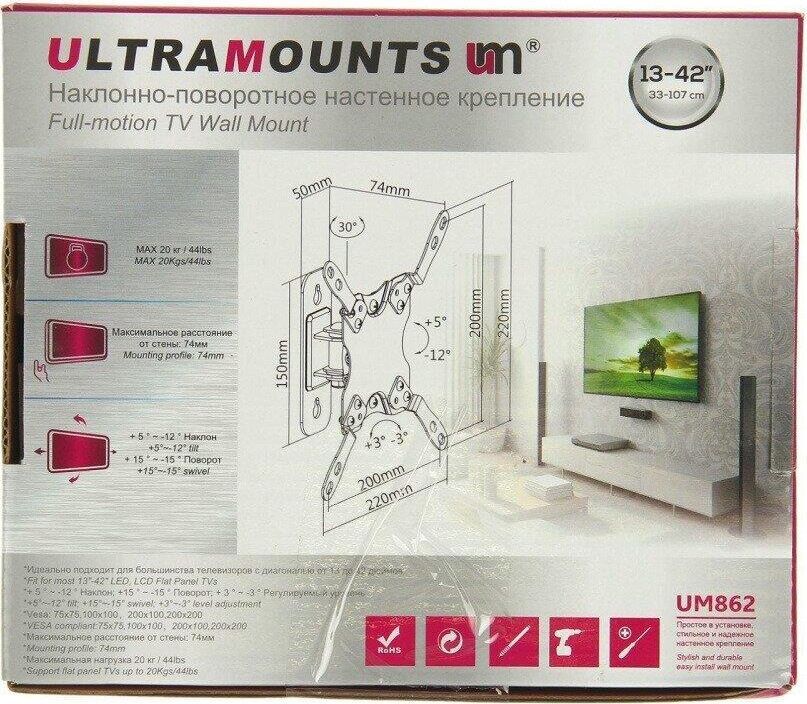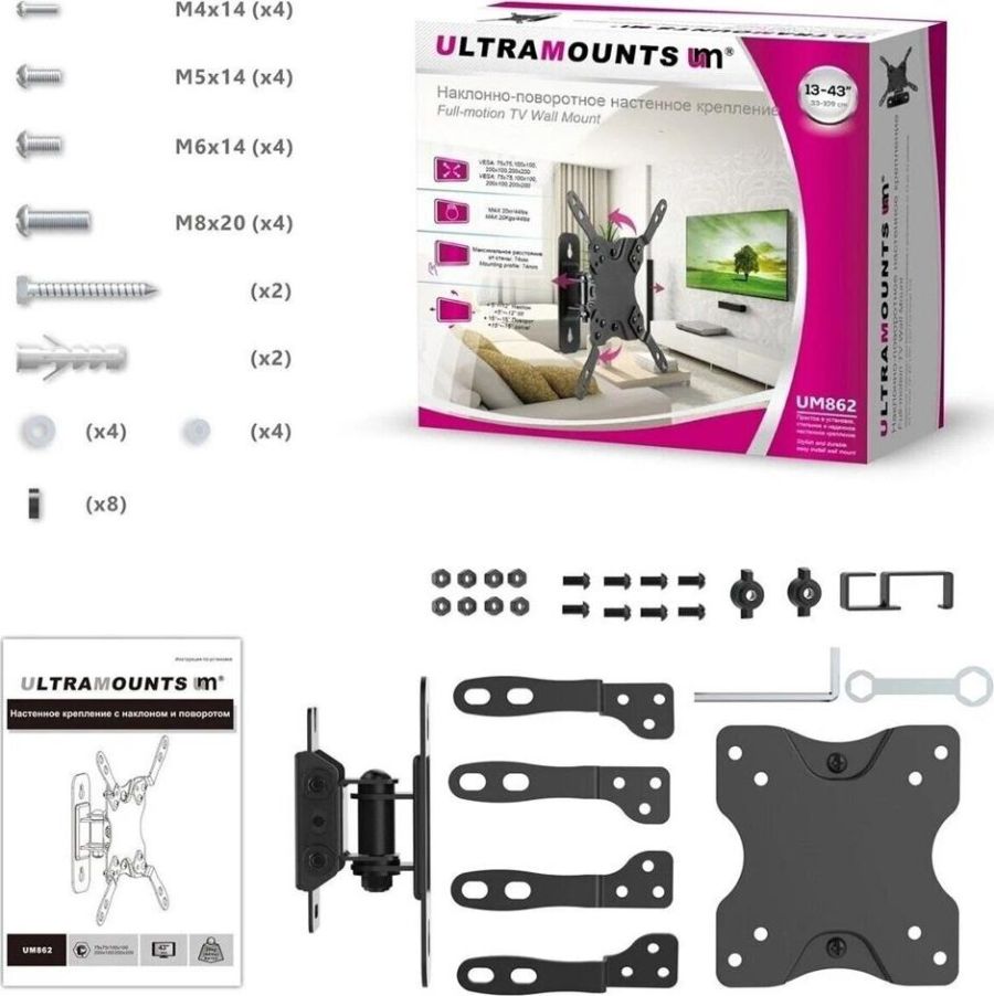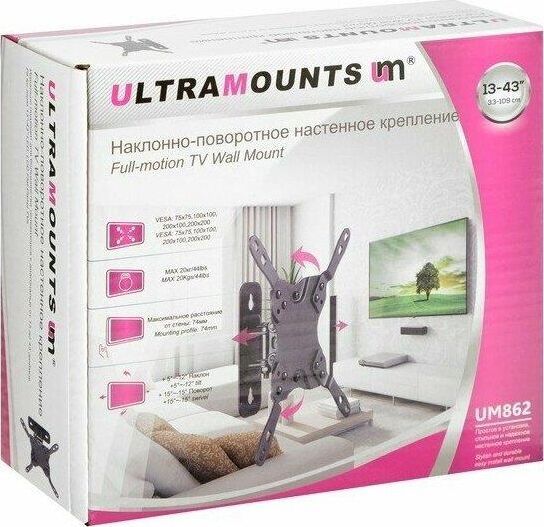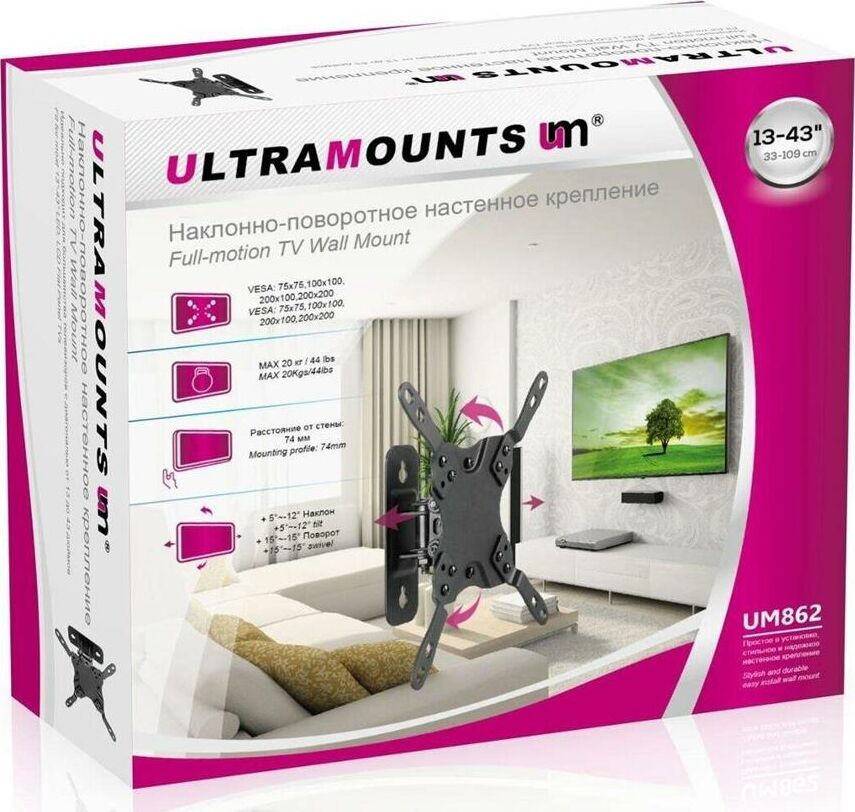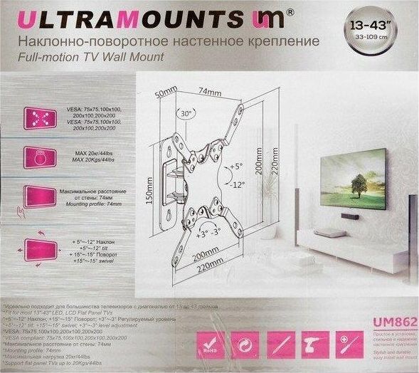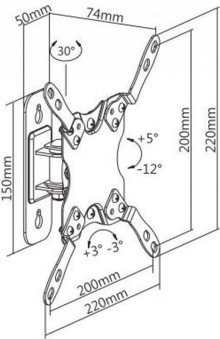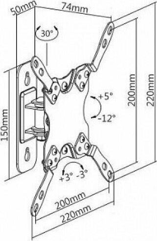 Наклонно-поворотный. Диагональ экрана: 13"-43". Подходит для изогнутых экранов. VESA: 75x75, 100x100, 200x100, 200x200. Максимальная нагрузка: 20 кг. Расстояние от стены: 74 мм. Угол поворота: +15°~-15°. Угол наклона: +5°~-12°. Горизонт экрана: +3°~-3°. Материал: холоднокатаная сталь. Протестировано весом в 2 раза больше максимально допустимого. Плавно и легко наклоняется и поворачивается. Конструкция свободного наклона. Встроенная регулировка уровня и индикатор поворота. Конструкция панели с VESA съёмная для лёгкой установки. Декоративные накладки для кабеля.
