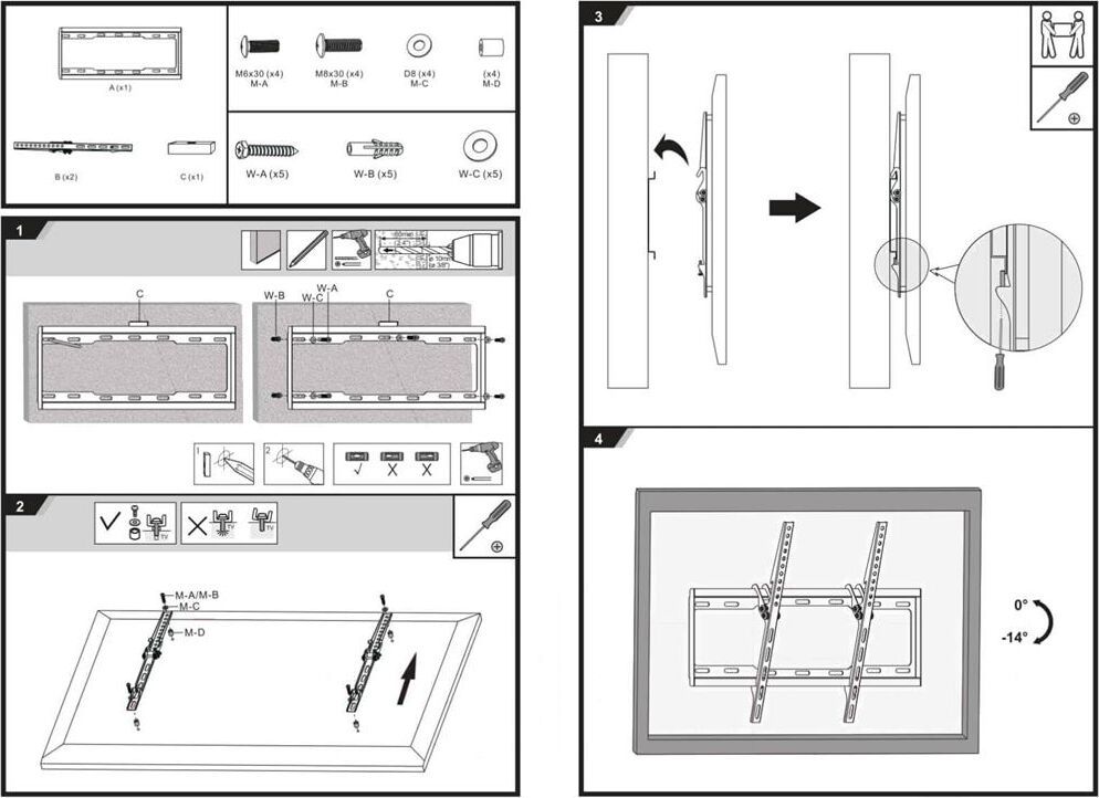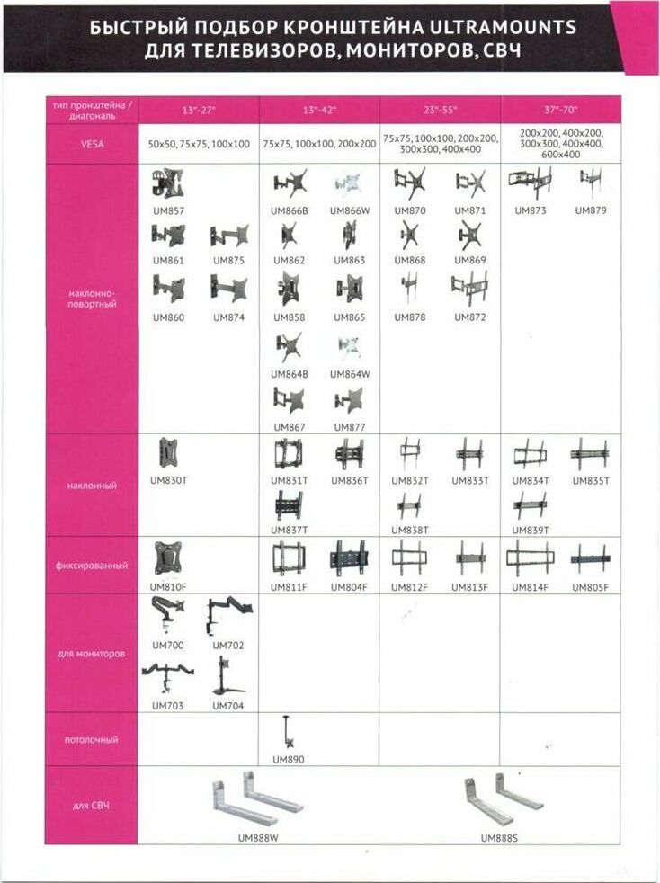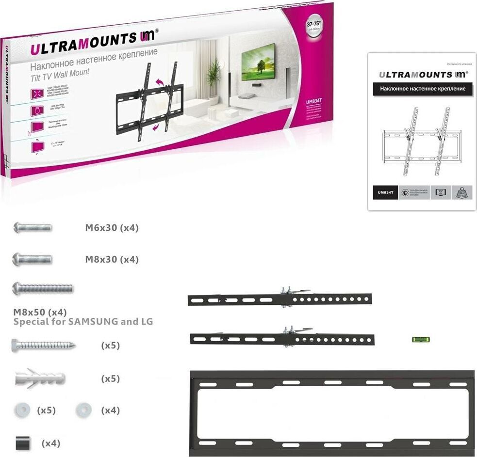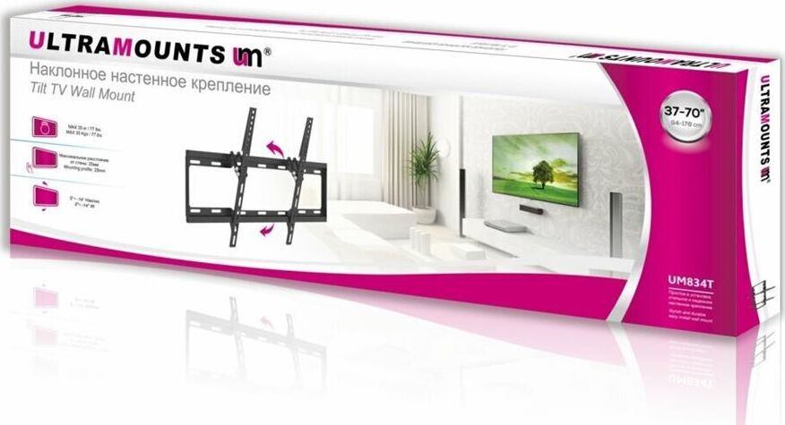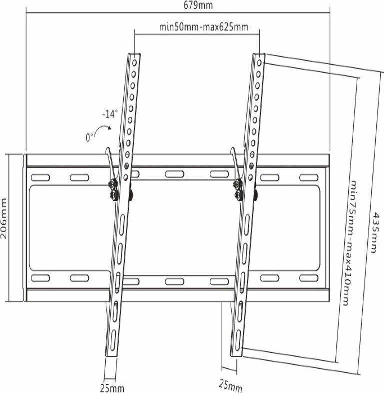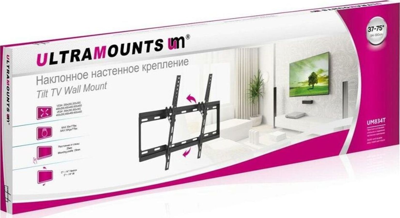 Диагональ экрана: 37"-75" VESA: 200x200, 300x300, 400x200, 400x400, 600x400 Нагрузка: до 35 кг Угол наклона: 0°~-14°