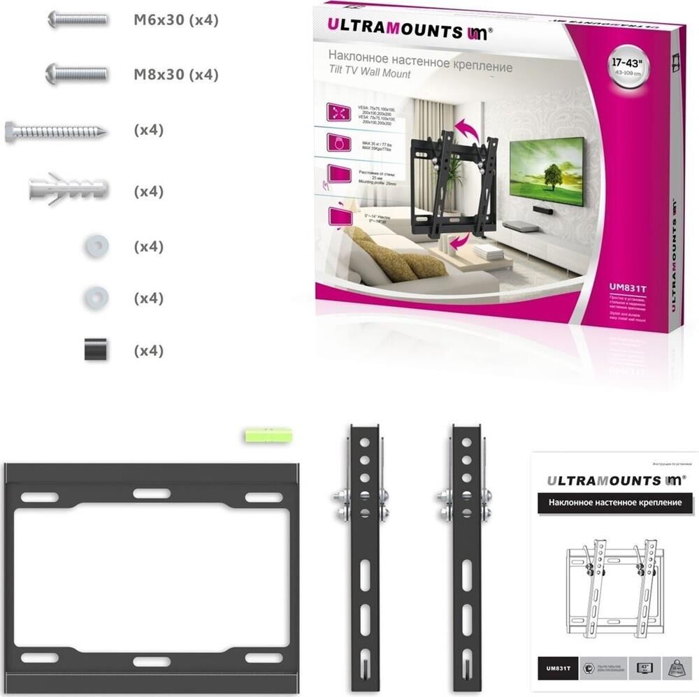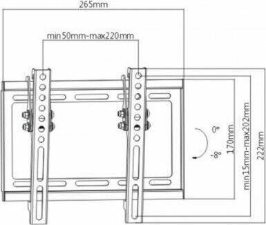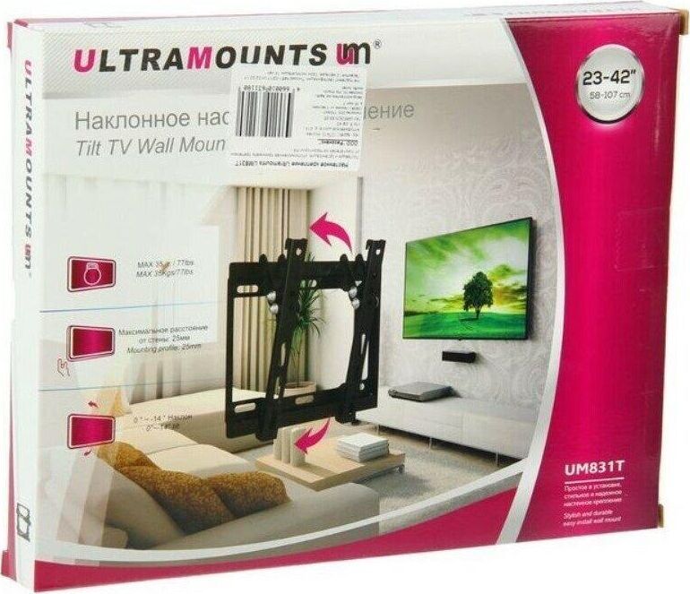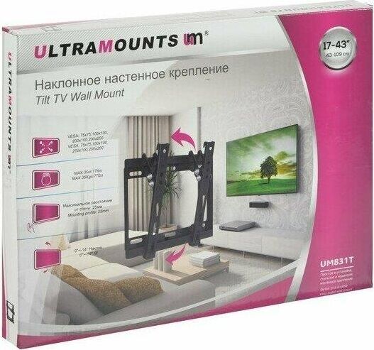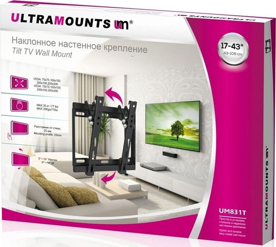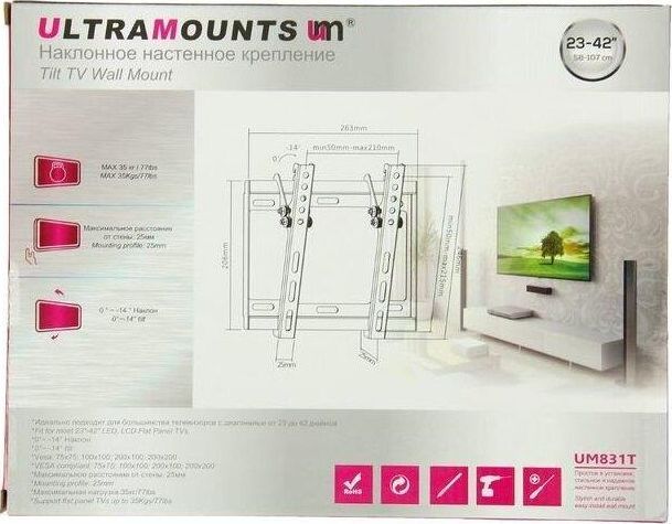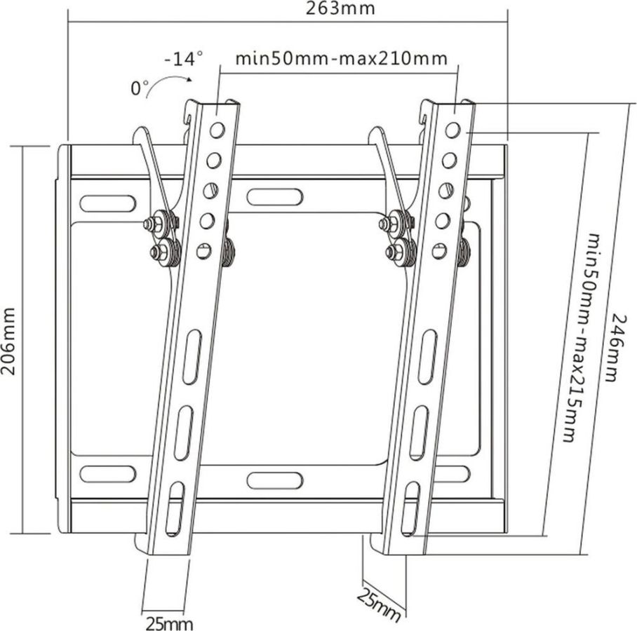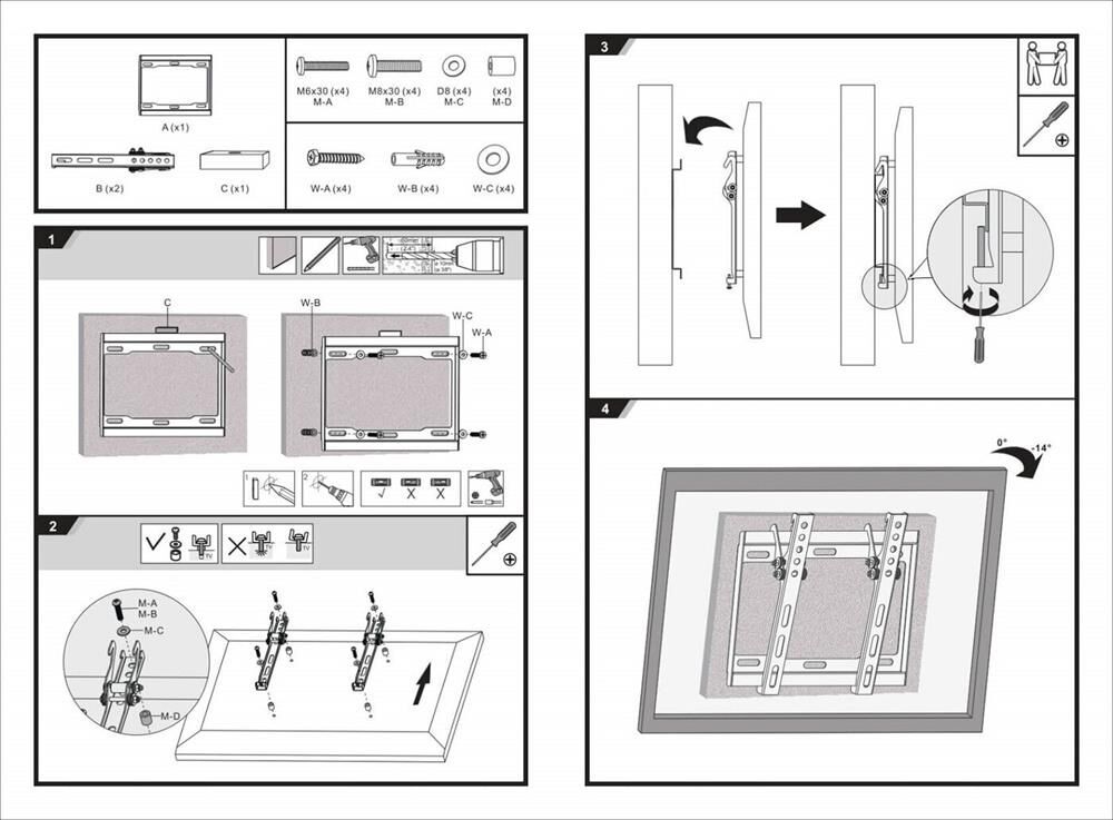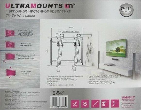 Диагональ экрана: 17"-43". Подходит для изогнутых телевизоров. VESA: 75x75, 100x100, 200x100, 200x200. Максимальная нагрузка: 35 кг. Расстояние от стены: 25 мм. Угол наклона: 0°~-14°. Цвет: черный. Материал: холоднокатаная сталь, пластик. Протестировано весом в 4 раза больше. Улучшенная вентиляция и облегчённый доступ к проводам. Конструкция свободного наклона. Уровень входит в комплектацию.