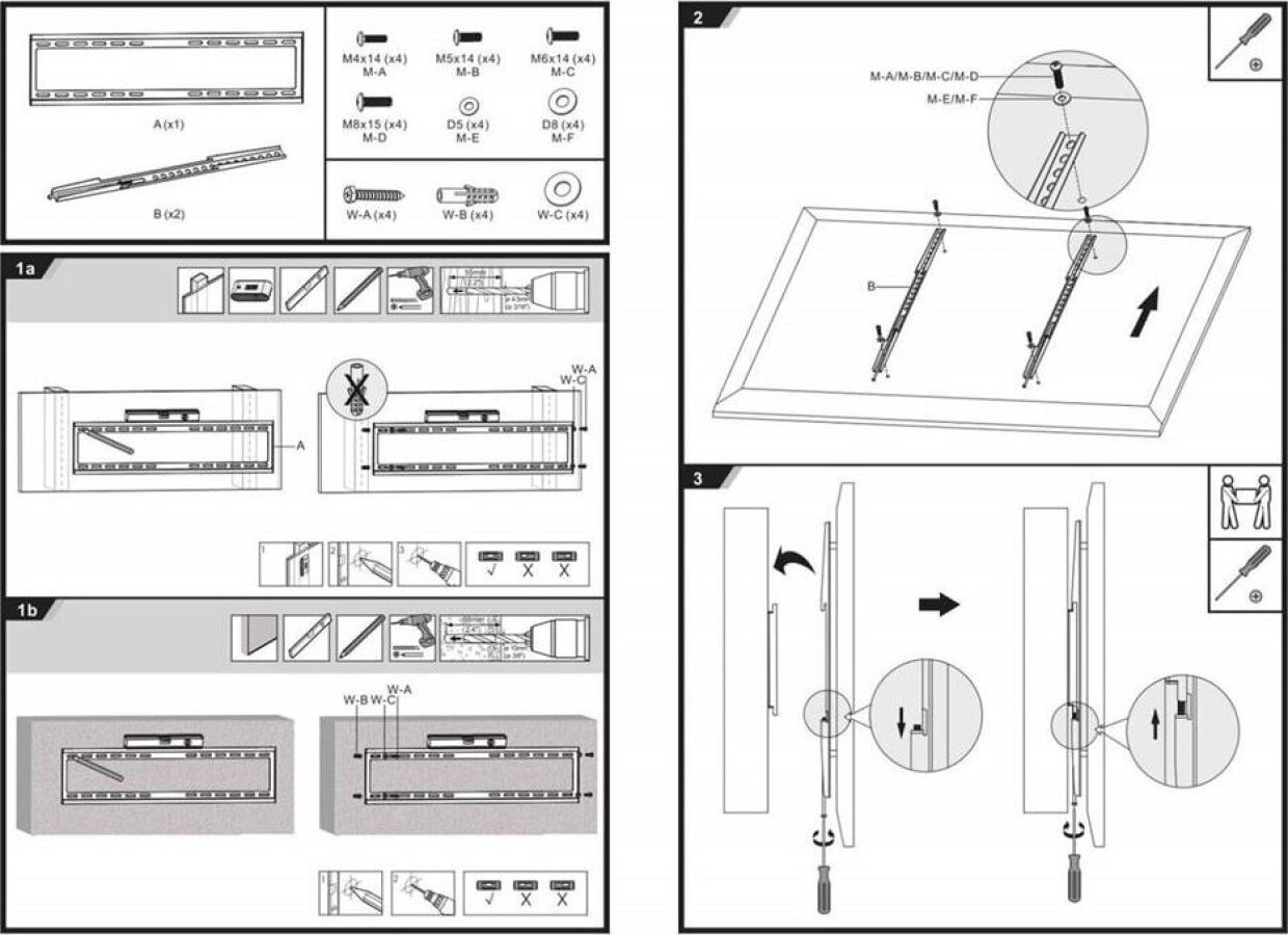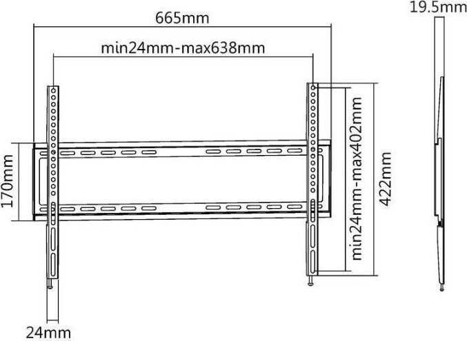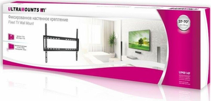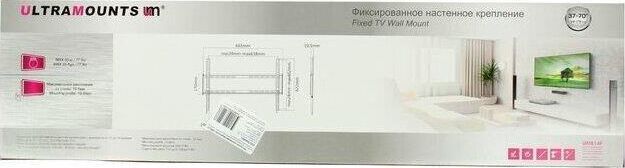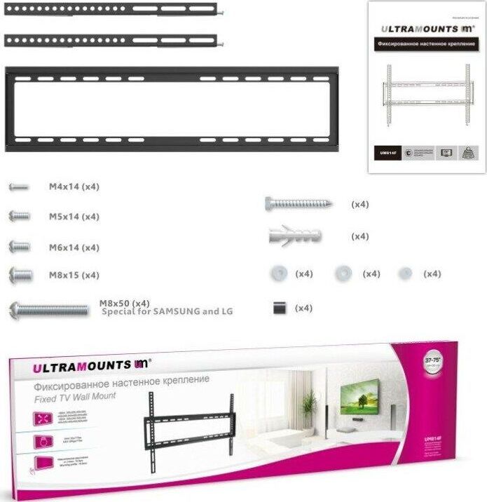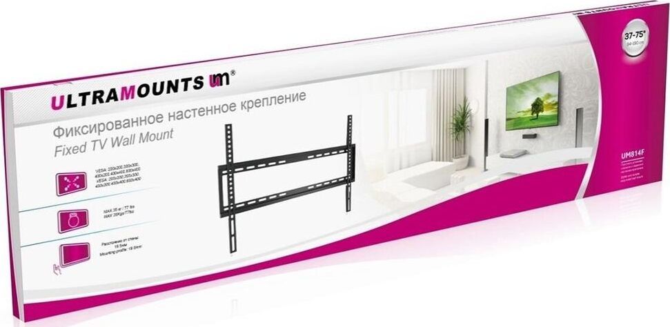 Диагональ экрана: 37"-75". VESA: 200x200, 300x300, 400x200, 400x400, 600x400. Максимальная нагрузка: 35 кг. Расстояние от стены: 19,5 мм. Материал: холоднокатаная сталь. Протестировано весом в 4 раза больше. Ультра-тонкий дизайн. Открытая конструкция с улучшенной вентиляцией и облегчённым доступом к проводам. Можно перемещать вправо-влево. Фиксирующие винты.