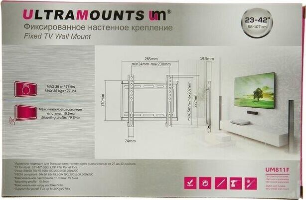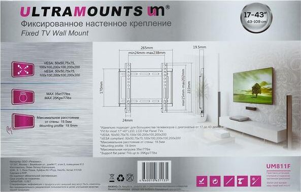 Диагональ экрана: 17"-43". VESA: 50x50, 75x75, 100x100, 200x100, 200x200. Максимальная нагрузка: 35 кг. Расстояние от стены: 19,5 мм. Материал: холоднокатаная сталь. Протестировано весом в 4 раза больше. Конструкция с улучшенной вентиляцией и доступом к проводам. Можно перемещать вправо-влево. Простой функциональный кронштейн легко устанавливается.