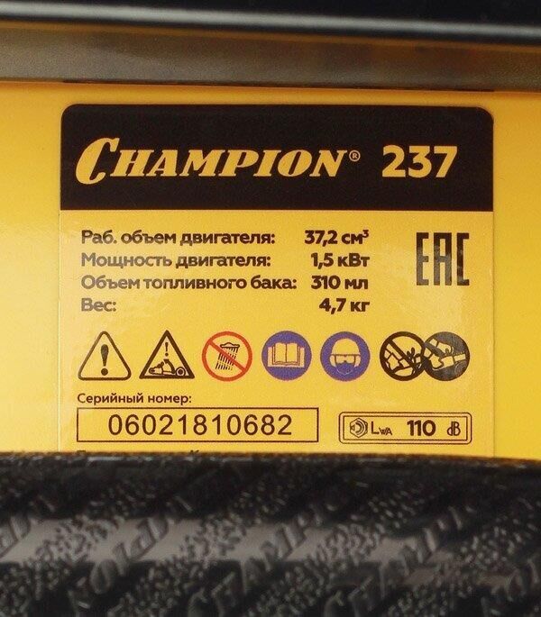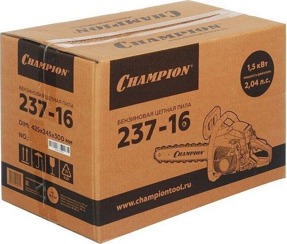 Комплект поставки: отвертка для настройки карбюратора, бензопила, руководство по эксплуатации, шина направляющая, цепь пильная, ключ свечной , Модификация (код производителя): 237-16 , Емкость топливного бака: 0.31 л , Емкость масляного бака: 0.21 л , Функции и возможности: регулировка натяжения цепи без инструмента, тормоз цепи, антивибрация