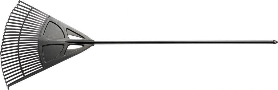 Грабли веерные пластиковые Palisad 61806 с 27 плоскими зубьями и шириной рабочей части 620 мм, с алюминиевым черенком, - садовый инвентарь, предназначенный для уборки мелкого мусора и листьев с газонов и грядок. Плоские зубья эффективно очищают территорию, не повреждая растительность. Грабли поставляются в сборе с черенком.ПреимуществаРабочая часть шириной 620 мм обеспечивает максимальный охват участка, что сокращает время уборки.Грабли изготовлены из эластичного и стойкого к ультрафиолету полипропилена, поэтому прослужат долго.На основании имеются ребра жесткости, повышающие прочность инструмента.Зубья дополнены распоркой для надежной защиты от поломок.