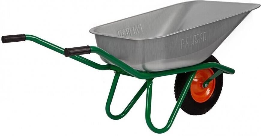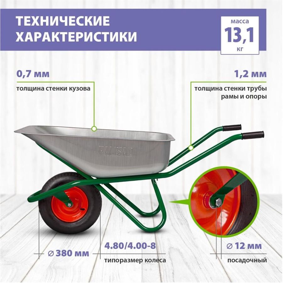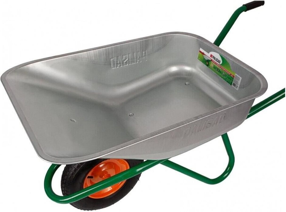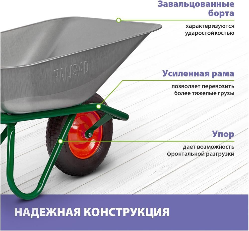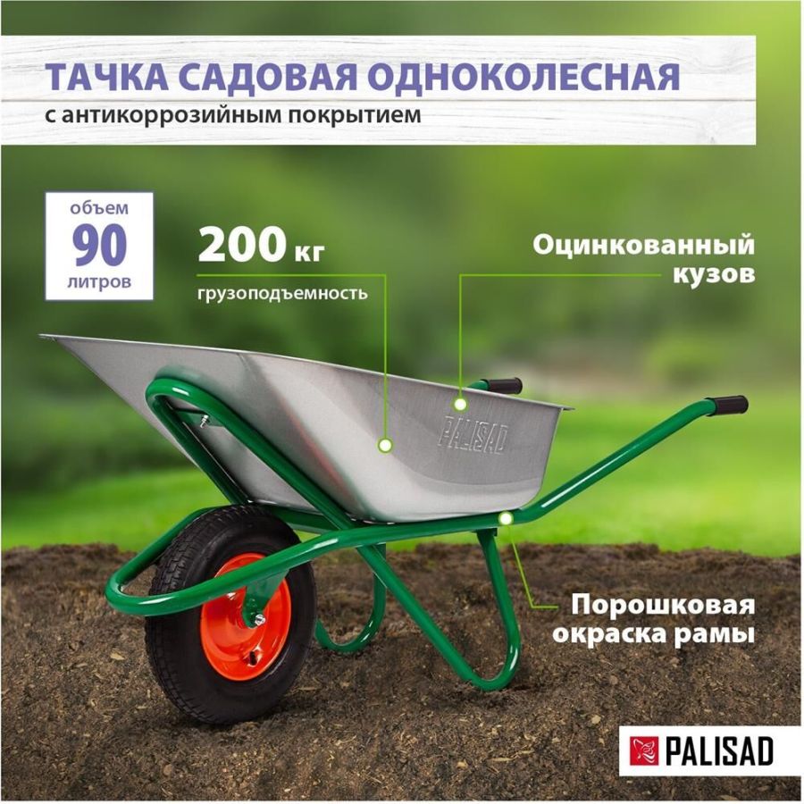 Усиленная садово-строительная тачка Palisad 689183 с кузовом объемом 90 л и грузоподъемностью 200 кг позволяет транспортировать строительные материалы, удобрения, урожай и другие грузы. Рассчитана на интенсивную эксплуатацию, подходит для выполнения большого объема работ. Тачка используется в строительстве и сельском хозяйстве.ПреимуществаУвеличенная прочность — рама выполнена из стальных труб диаметром 32 мм и толщиной 1,2 мм, а кузов — из стали толщиной 0,7 мм.Надежность — завальцованные борта обеспечивают ударостойкость верхнего края кузова.Защита от коррозии — кузов оцинкован, а на раму, опору и диск колеса нанесено порошковое покрытие.Маневренность и хорошая проходимость — тачку с одним пневматическим колесом на 2-х шариковых подшипниках удобно перемещать и разворачивать.Высокая грузоподъемность — благодаря дополнительной опоре кузов выдерживает до 200 кг.Удобная фронтальная разгрузка — в конструкции тачки предусмотрен передний упор.