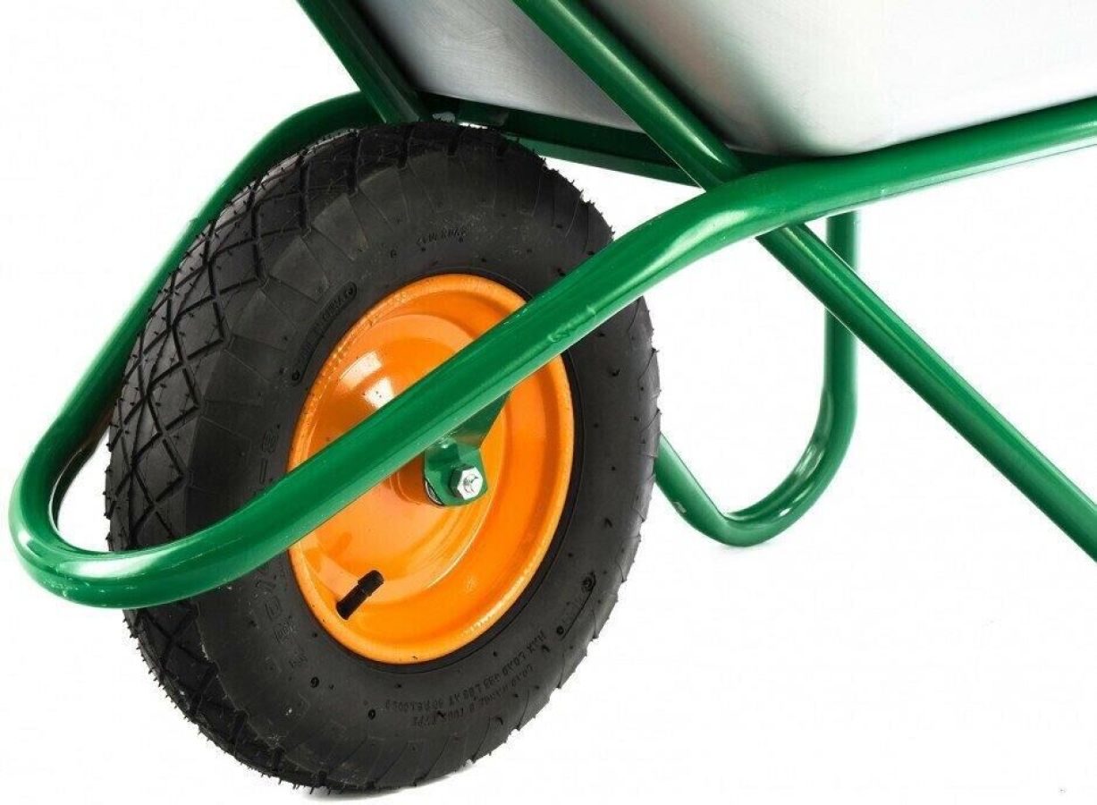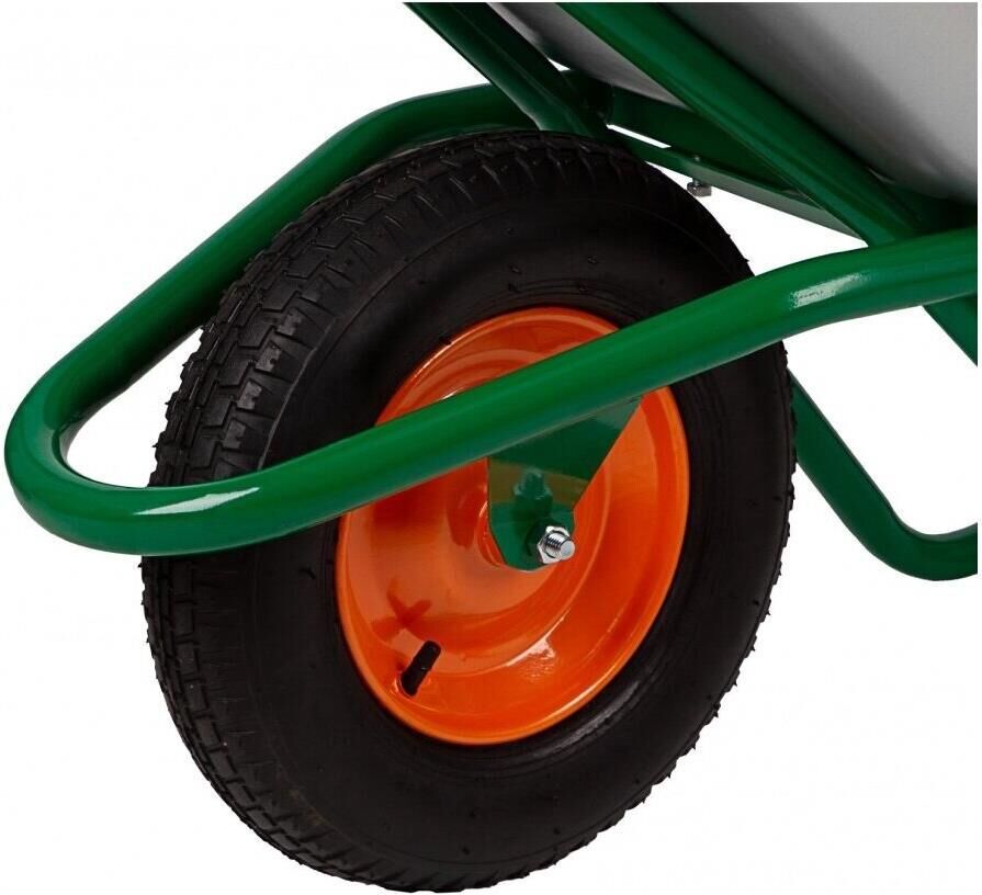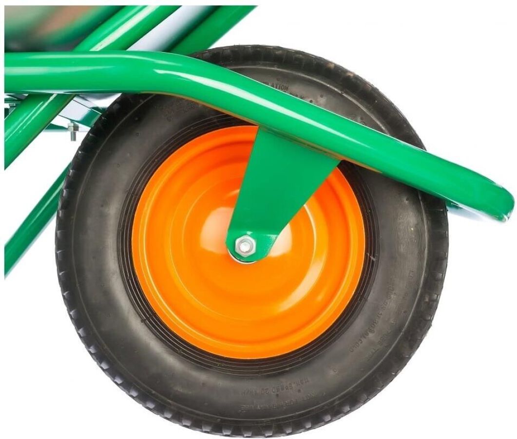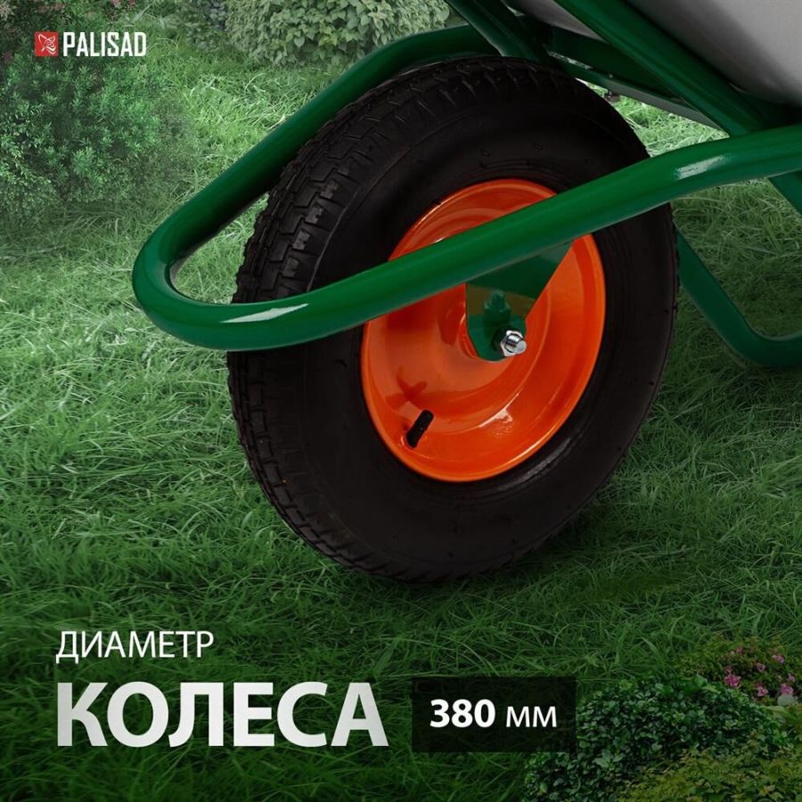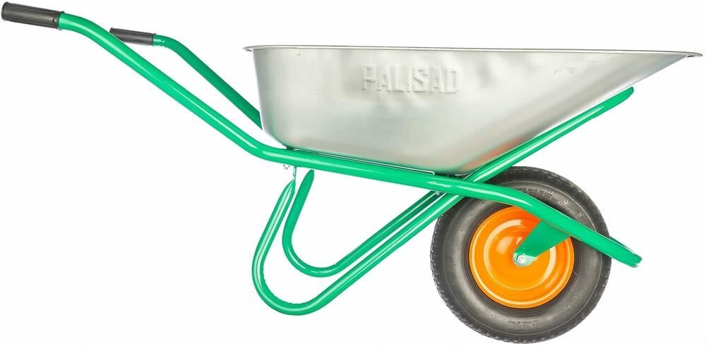 Усиленная садово-строительная тачка Palisad 689183 с кузовом объемом 90 л и грузоподъемностью 200 кг позволяет транспортировать строительные материалы, удобрения, урожай и другие грузы. Рассчитана на интенсивную эксплуатацию, подходит для выполнения большого объема работ. Тачка используется в строительстве и сельском хозяйстве.ПреимуществаУвеличенная прочность — рама выполнена из стальных труб диаметром 32 мм и толщиной 1,2 мм, а кузов — из стали толщиной 0,7 мм.Надежность — завальцованные борта обеспечивают ударостойкость верхнего края кузова.Защита от коррозии — кузов оцинкован, а на раму, опору и диск колеса нанесено порошковое покрытие.Маневренность и хорошая проходимость — тачку с одним пневматическим колесом на 2-х шариковых подшипниках удобно перемещать и разворачивать.Высокая грузоподъемность — благодаря дополнительной опоре кузов выдерживает до 200 кг.Удобная фронтальная разгрузка — в конструкции тачки предусмотрен передний упор.