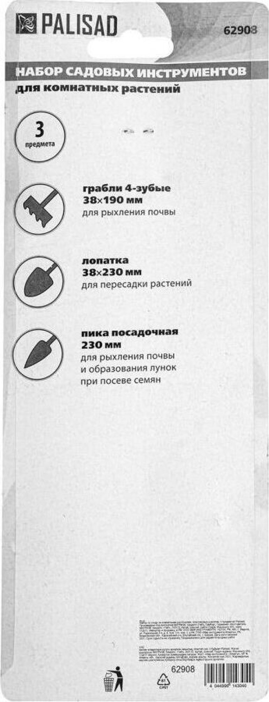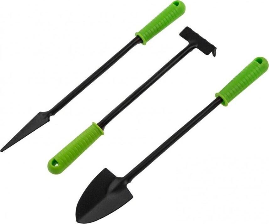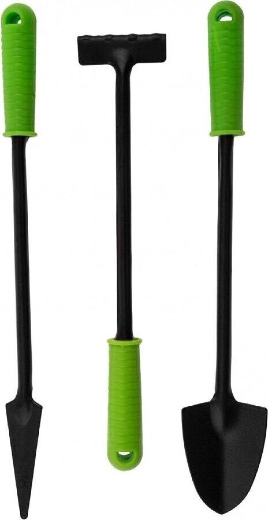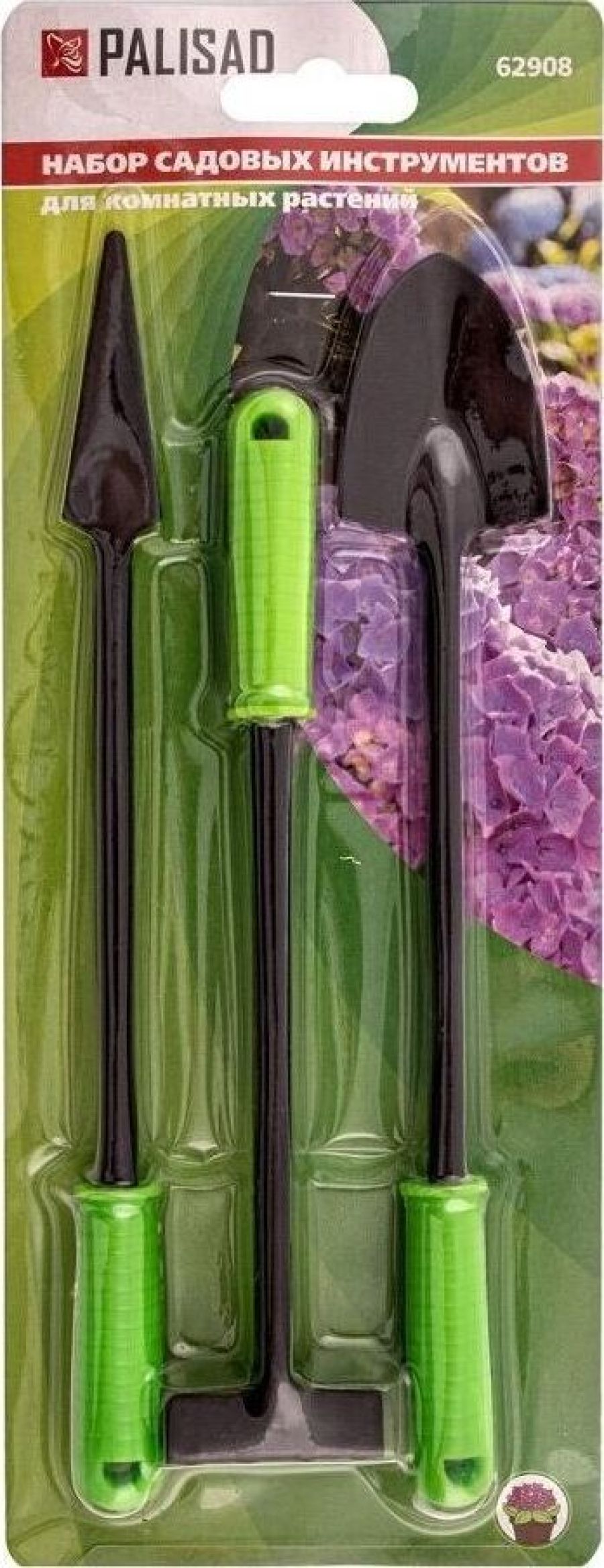 Набор инструмента предназначен для работ по уходу за комнатными растениями и цветами. В состав набора входят: Лопатка 38х230 мм Грабли четырехзубые 38х190 мм Пика посадочная 230 мм Особенности Инструмент изготовлен из конструкционной стали и покрыт порошковой эмалью Снабжен пластиковой рукояткой Преимущества Надежный, долговечный инструмент Не подвержен коррозии Комплектация Лопатка - 1 шт. Грабли четырехзубые - 1 шт. Пика посадочная - 1 шт.