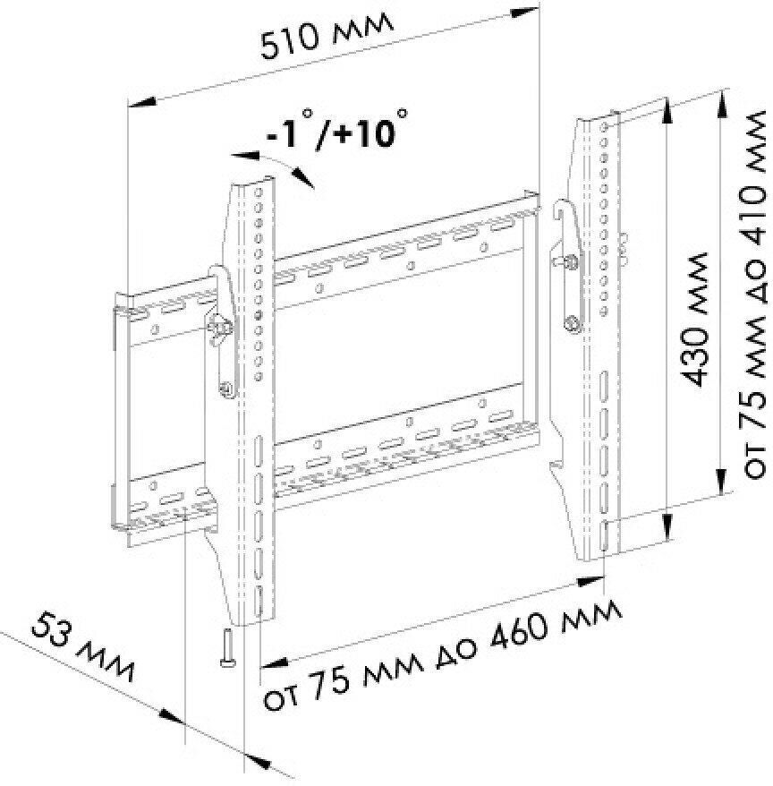 Тип регулировки наклон. Максимальная нагрузка 75 кг. Минимальная диагональ экрана 26". Максимальная диагональ экрана 42". Максимальное расстояние от стены 53 мм. Цвет черный. Стандарт VESA: 75x75; 100x100; 200x100; 200x200; 300x300; 400x400