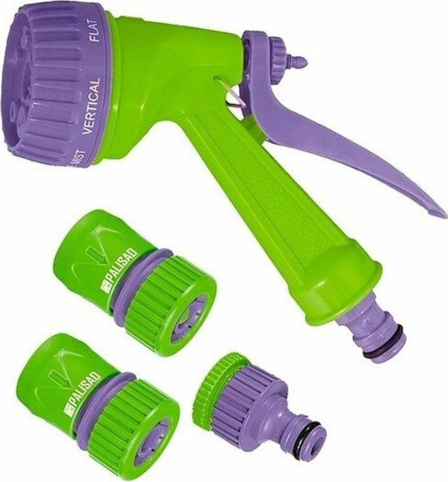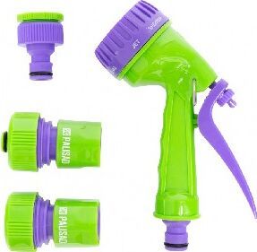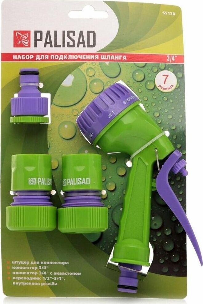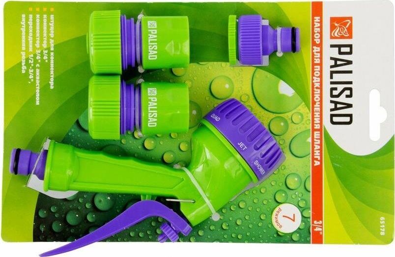 Поливочный набор из 4 предметов. Предназначен для подключения шланга 3/4 к системе полива. Распылитель, материал: прочный АБС-пластик. Благодаря регулируемой головке, имеет семь режимов полива: душ, режим задействования всех отверстий, мелкий туман, плоско-вертикальная струя, плоско-горизонтальная струя, туман, жесткая струя, что позволяет выбрать наиболее подходящий режим для любого типа посадок, а также для очистки. Имеется фиксатор курка для непрерывной работы. Быстросъемный соединитель 3/4, материал: прочный АБС-пластик. Надевается на шланг. Позволяет быстро и многократно подсоединять/отсоединять шланг к системе полива через адаптер-переходник. Быстросъемный соединитель 3/4" с функцией аквастопа, материал: прочный АБС-пластик. Надевается на шланг. Позволяет быстро и многократно подсоединять/отсоединять распылитель к шлангу. За счет функции аквастопа подача напора автоматически прекращается при отсоединении распылителя от шланга и возобновляется при подсоединении. Адаптер-переходник 1/2 8213; 3/4, внутренн
