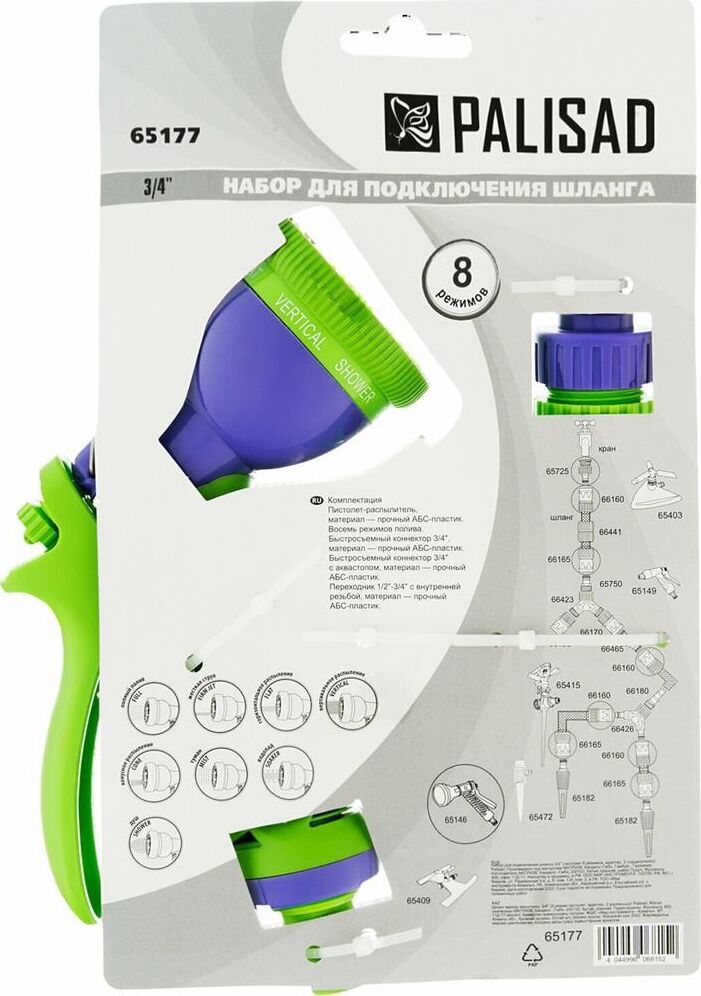 Комплектация: быстросъемный соединитель 3/4" - 1 шт; быстросъемный соединитель 3/4" с функцией аквастопа - 1 шт; адаптер-переходник 1/2" Х 3/4"; распылитель - 1 шт
