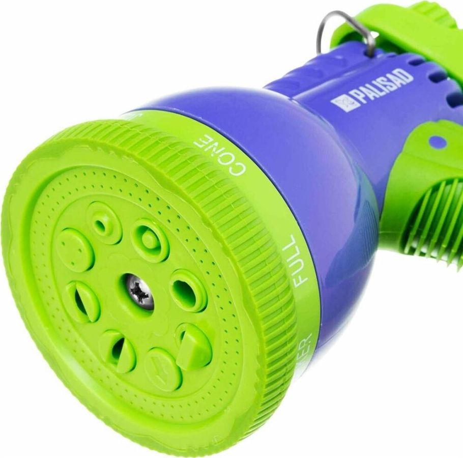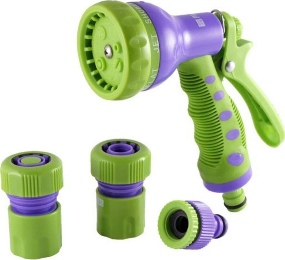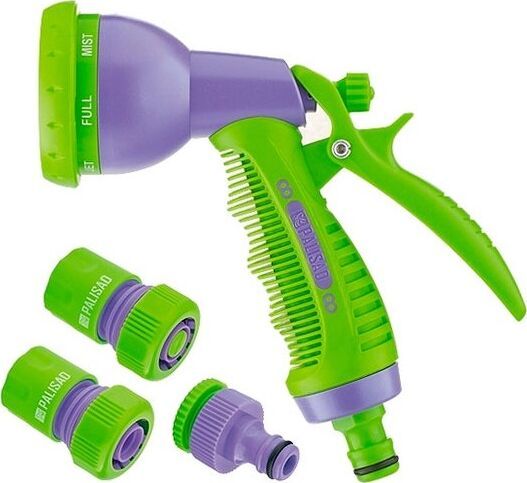 Поливочный набор из 4 предметов. Предназначен для подключения шланга 3/4" к системе полива: Распылитель, материал: прочный АБС-пластик. Благодаря регулируемой головке, имеет шесть режимов полива: душ, туман, конусная струя, центральная струя, плоско-горизонтальная струя, жесткая струя, что позволяет выбрать наиболее подходящий режим для любого типа посадок, а также для очистки. Имеется фиксатор курка для непрерывной работы. Быстросъемный соединитель 3/4", материал: прочный АБС-пластик. Надевается на шланг. Позволяет быстро и многократно подсоединять/отсоединять шланг к системе полива через адаптер-переходник. Быстросъемный соединитель 3/4" с функцией аквастопа, материал: прочный АБС-пластик. Надевается на шланг. Позволяет быстро и многократно подсоединять/отсоединять распылитель к шлангу. За счет функции аквастопа подача напора автоматически прекращается при отсоединении распылителя от шланга и возобновляется при подсоединении. Адаптер-переходник 1/2"-3/4", внутренняя резьба, материал: прочный АБС-пластик. На
