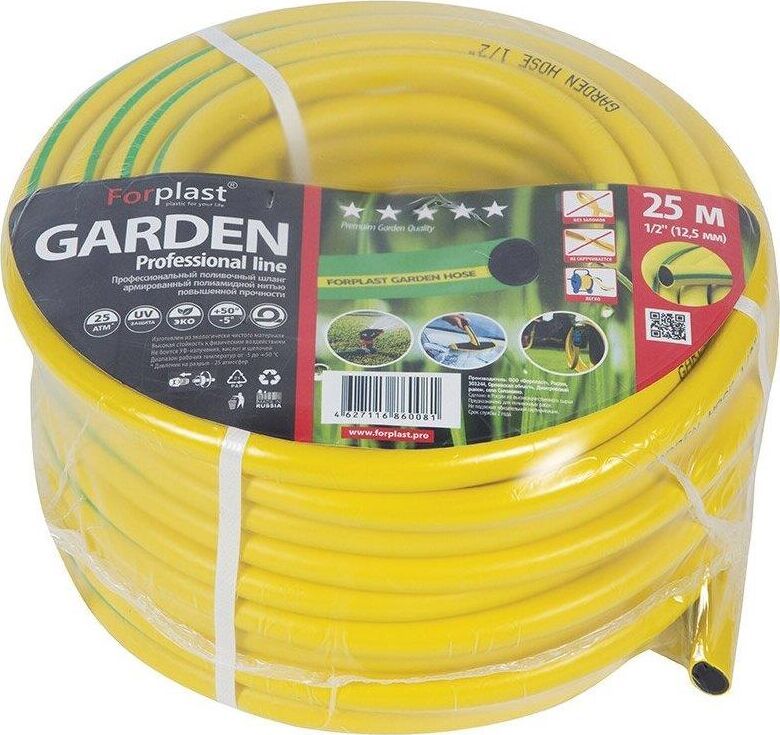Шланг ПВХ GARDEN, напорный (арм) 1/2" 25м (раб.давл. 10 атм) армированный, полив, непрозр. Трёхслойный армированный поливочный шланг из ПВХ. Рабочее давление 10 атм. Шланг обладает повышенной прочностью благодаря увеличенной толщине стенки. Диапазон рабочих температур от 0 до +50 градусов. Верхний слой выполняется в 2-х цветовых решениях - зелёном и жёлтом, нижний слой - чёрный. По всей длине шланга нанесена полоса и надпись. Толщина стенки 2,2 мм, вес бухты 3,25кг.