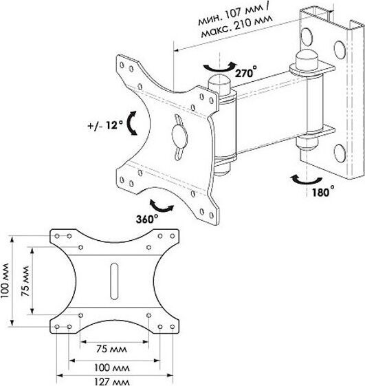 Кронштейн ЖК 75 предназначен для крепления на стену LCD, LED, ЖК телевизора с диагональю экрана 15" -23" (38 см – 58,4 см). Тип: наклонно - поворотный, с вращением и частичным складывание (угол +/- 12°, поворот +/-180°). Стандарт VESA: 75*75, 100*100, 100*127. Нагрузка макс: 25 кг.