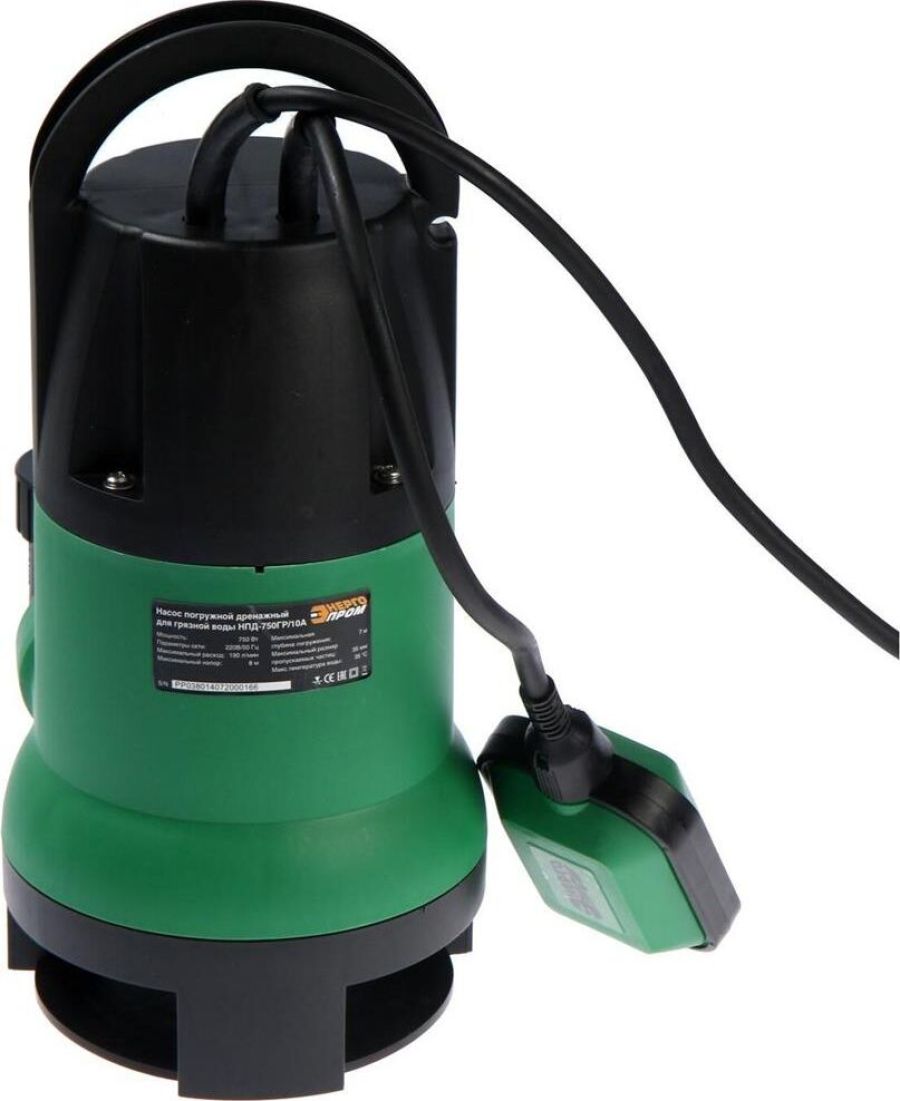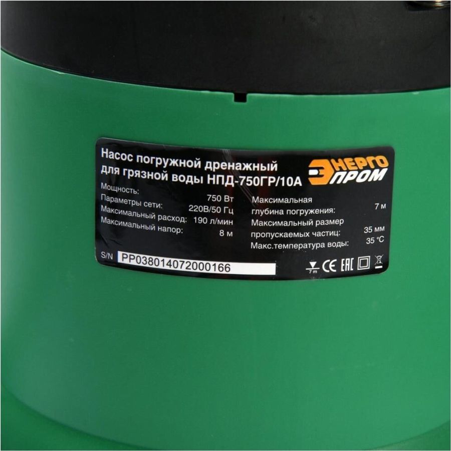 Мощность, Вт: 750. Параметры сети: 220В/ 50Гц. Максимальный расход воды л/ч: 12500. Max высота подачи воды м: 8. Глубина всасывания , м: 7. Максимальный размер пропускаемых частиц, мм:35. Макс.температура воды, ◦С: 35.