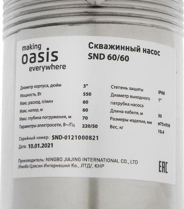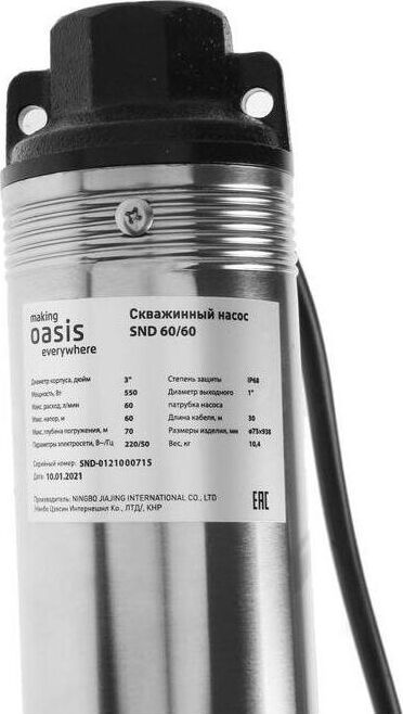 Насос скважинный OASIS, Медная обмотка двигателя, Мощность - 900 Вт, Диаметр корпуса - 3", Производительность - 60 л/мин, Максимальный напор - 60 м, Макс. глубина погружения 70 м, Макс. допускаемая концентрация твердых частиц в воде - 100 г/м3, Макс. размер пропускаемых частиц - 1,5-2 мм, Количество импеллеров - 17, Длина шнура - 30 м.